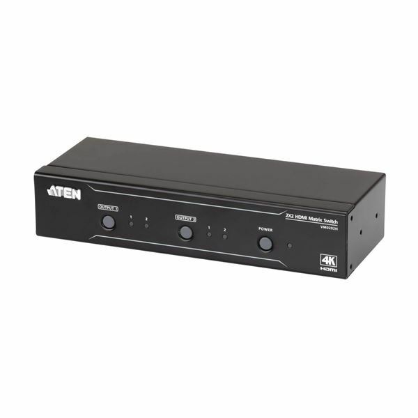 Aten 4-portni HDMI stikalo 2x2 VM0202H, z dvema HDMI izhodoma za zaslon-projektor. Za priklop do dva HDMI vira (računalnika, avdio-video sprejemnika…) na dva digitalna HDMI izhoda kot sta zaslon in projektor.