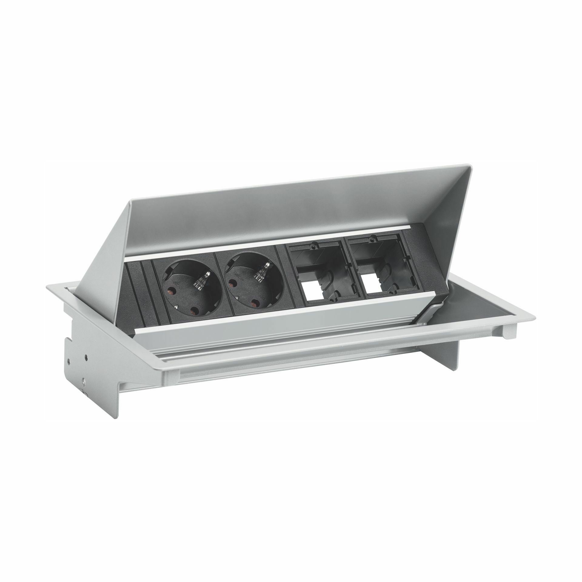 Bachmann kvaliteten komplet z vgradnim ohišjem in razdelilcem 2x220V, primeren za montažo v mizo, idealna in ugodna rešitev za pisarne in sejne sobe.