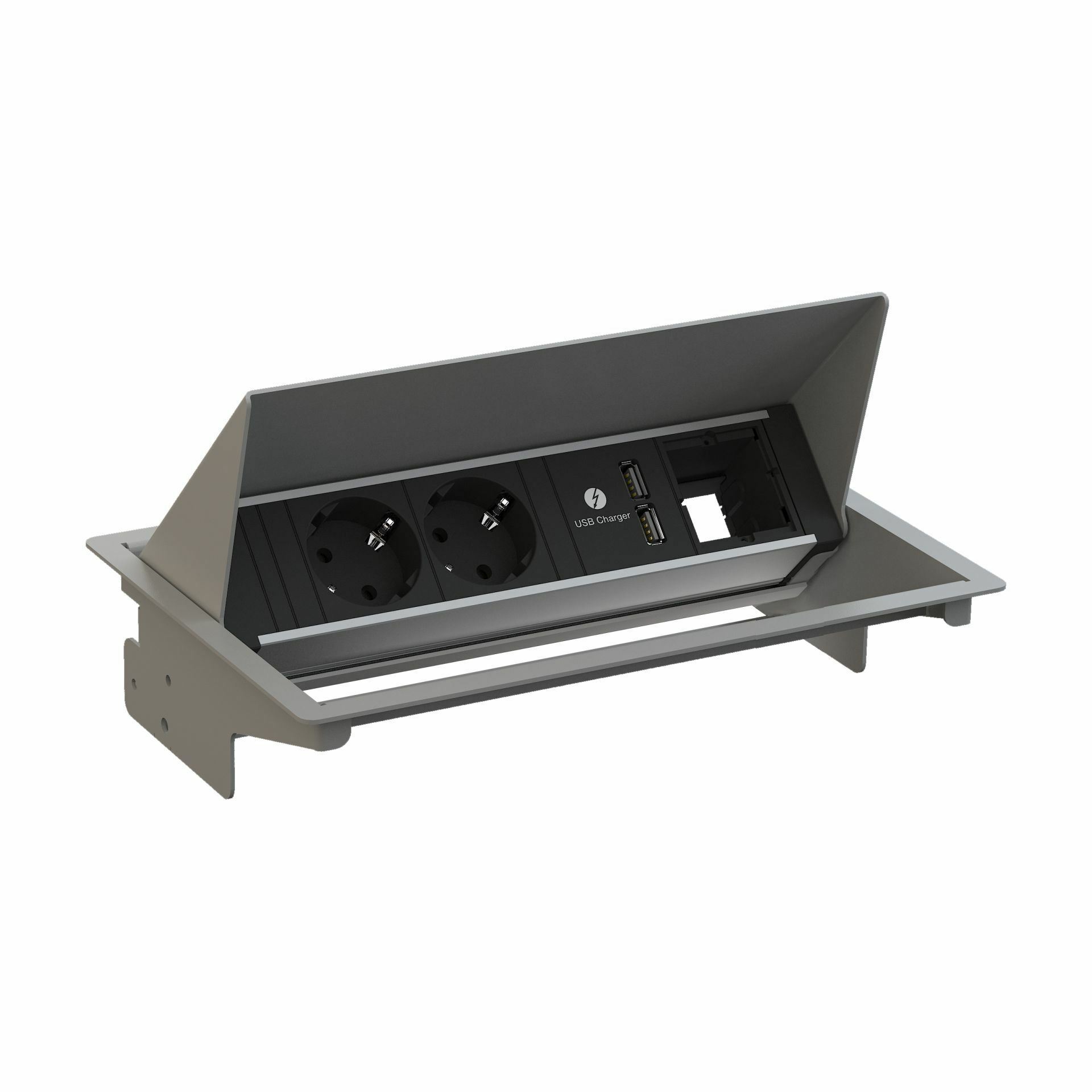 Bachmann kvaliteten komplet z vgradnim ohišjem in razdelilcem 2x220V, primeren za montažo v mizo, idealna in ugodna rešitev za pisarne in sejne sobe.