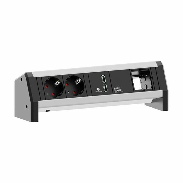 Bachmann namizni razdelilec DESK 1 z 2x 220V vtičnicama, 2x USB priključkoma in 1x praznim mestom za dodatni modul. Namenjen montaži na mizo, omogoča enostaven dostop do napajanja. Idealna rešitev za pisarne in sejne sobe, zagotavlja praktičnost in urejenost delovnega prostora.