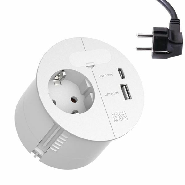 Z Loop in Charge Bachmann predstavlja elegantno namizno priključno ploščo za vsestransko uporabo v pisarni: vgrajena vtičnica ponuja napajanje in funkcijo polnjenja v enem. USB A/C polnilec z Power Delivery omogoča polnjenje pametnih telefonov in drugih manjših naprav med delom za mizo. Za namestitev vtičnice z vodilom za kabel preprosto izvrtajte 80 mm luknjo v ploščo mize.