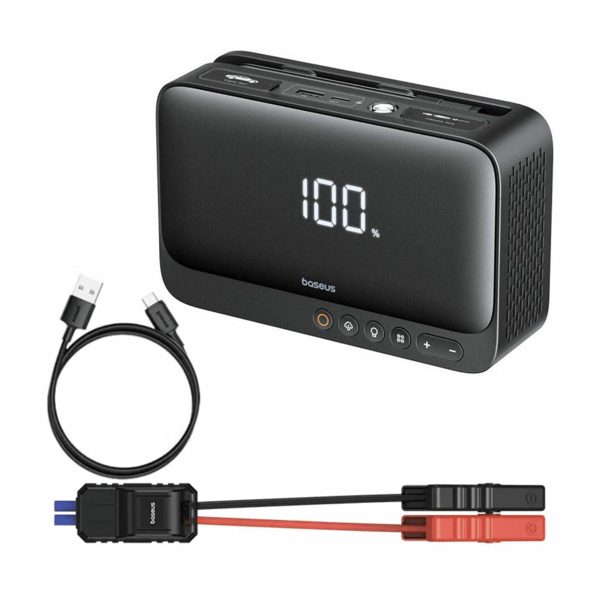 Baseus prenosna avtomobilska zagonska baterija z vgrajeno zračno tlačilko je nepogrešljiv dodatek v vsakem osebnem avtomobilu. Praktična naprava, ki bo zagnala vaš avtomobil v primeru izpraznjene baterije. Vgrajeno zračno tlačilko pa lahko uporabite v primeru izpraznjene pnevmatike. LED luč pa poskrbi za pomoč v temi.