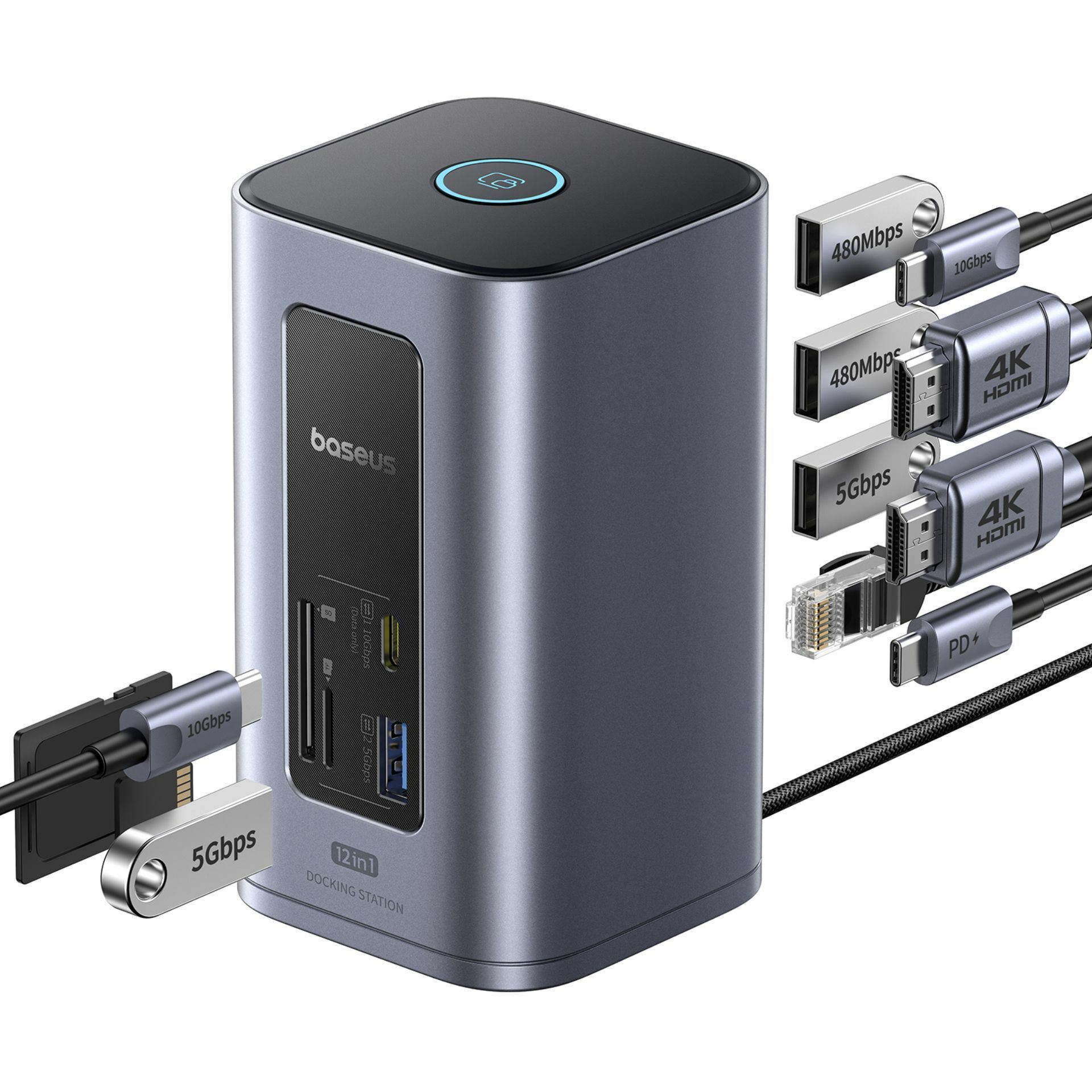 Baseus Nomos NU1 Air tower docking station je 12-v-1 USB-C priklopna postaja z dvema HDMI 4K 60 Hz izhodoma, dvema USB-C 10Gbps, štirimi USB-A vhodi, režama SD/TF, RJ45 Gigabit ter USB-C PD napajanjem 100 W v sivem ohišju.
