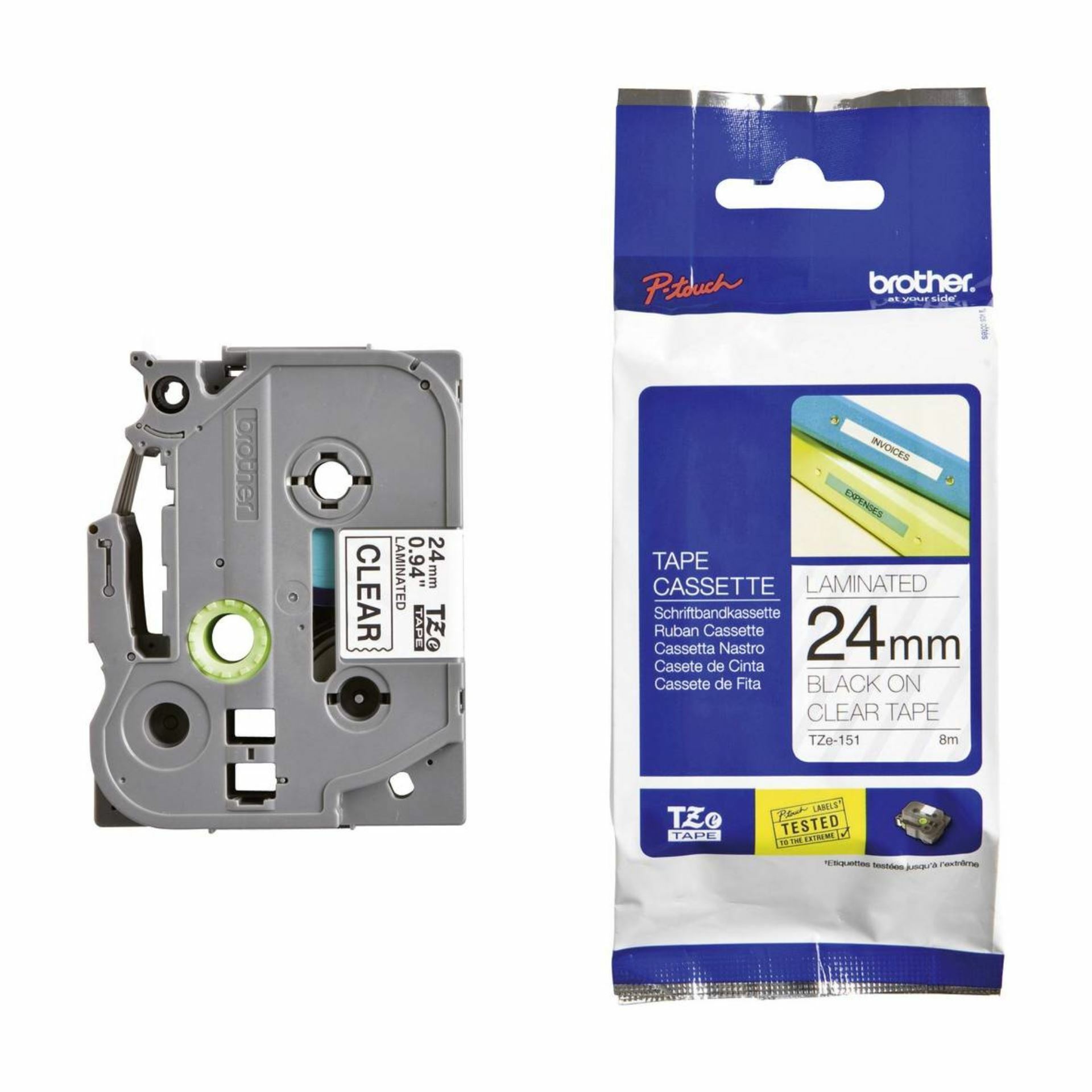 Kakovostni laminiran TZe Brother trak, širine 24mm in skupne dolžine 8m. Trak je prozorne barve in omogoča potisk v črni barvi…