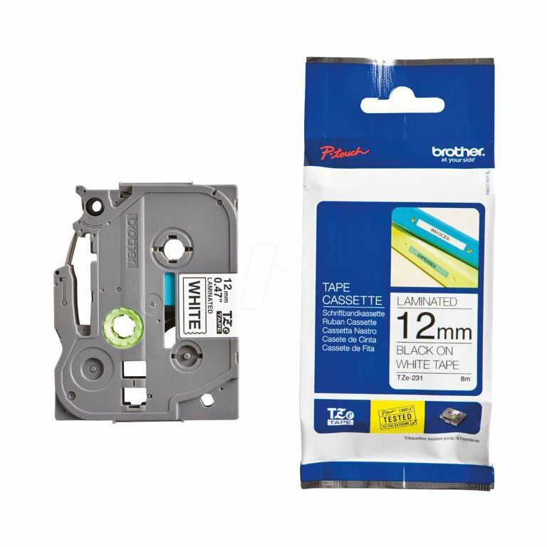 Kakovostni laminiran TZe Brother trak, širine 12mm in skupne dolžine 8m. Trak je bele barve in omogoča potisk v črni barvi…