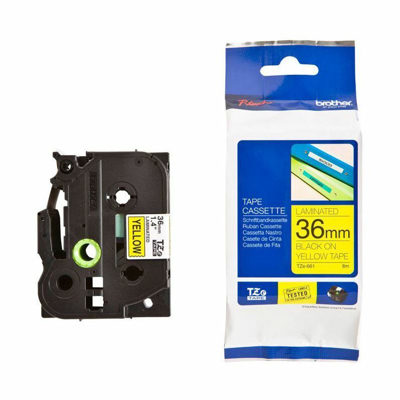 Kakovostni laminiran TZe Brother trak, širine 36mm in skupne dolžine 8m. Trak je rumene barve in omogoča potisk v črni barvi…