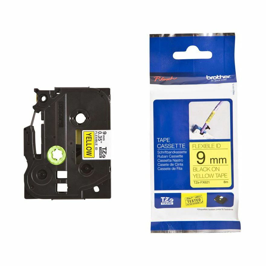 Kakovostni laminiran TZe Brother trak, širine 9mm in skupne dolžine 8m. Trak je rumene barve in omogoča potisk v črni barvi