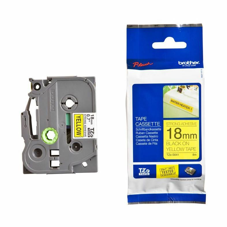 Kakovostni laminiran TZe Brother trak, širine 18mm in skupne dolžine 8m. Trak je rumene barve in omogoča potisk v črni barvi…
