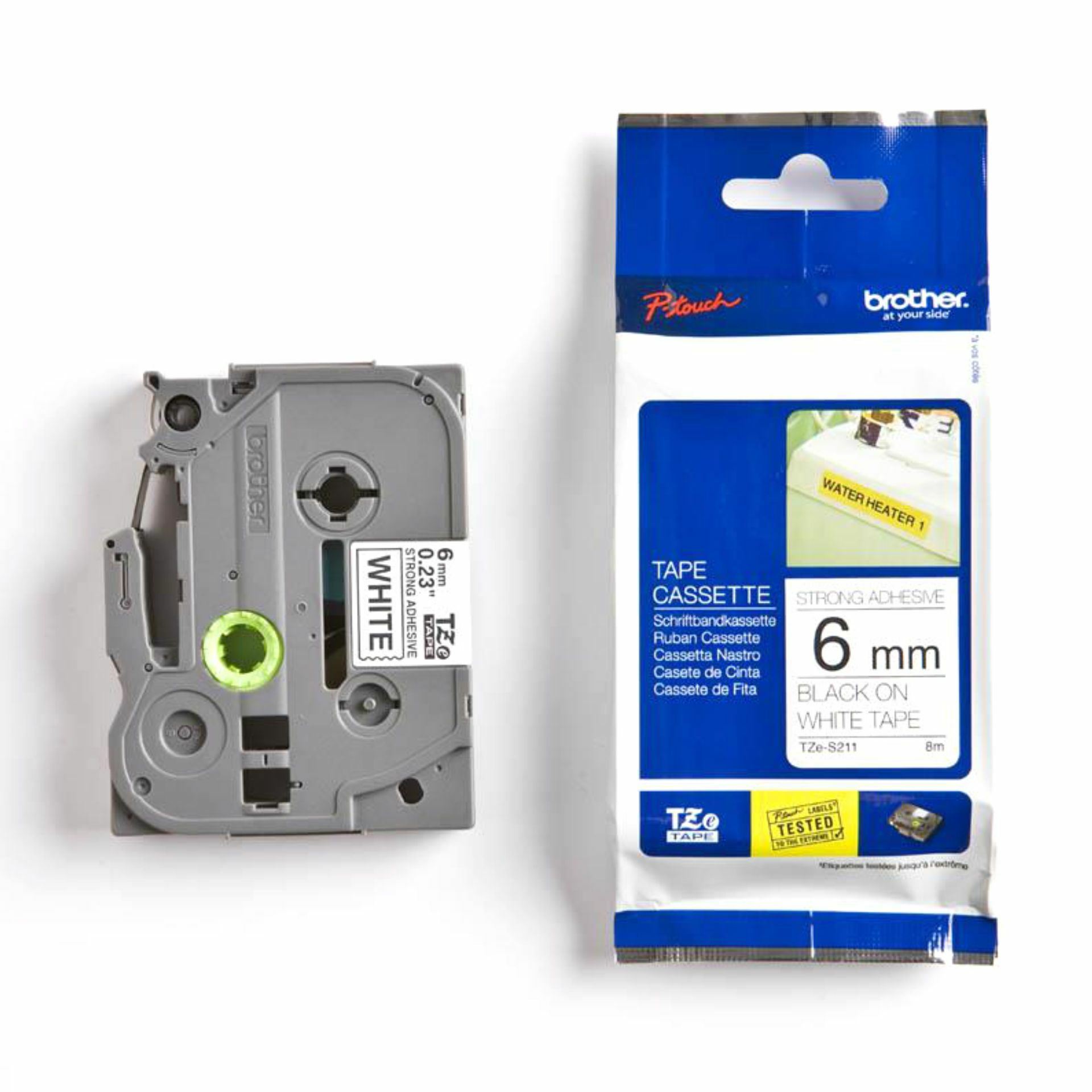 Kakovostni TZe Brother trak z močnejšim lepilom, širine 6mm in skupne dolžine 8m. Trak je bele barve in omogoča potisk v črni barvi…