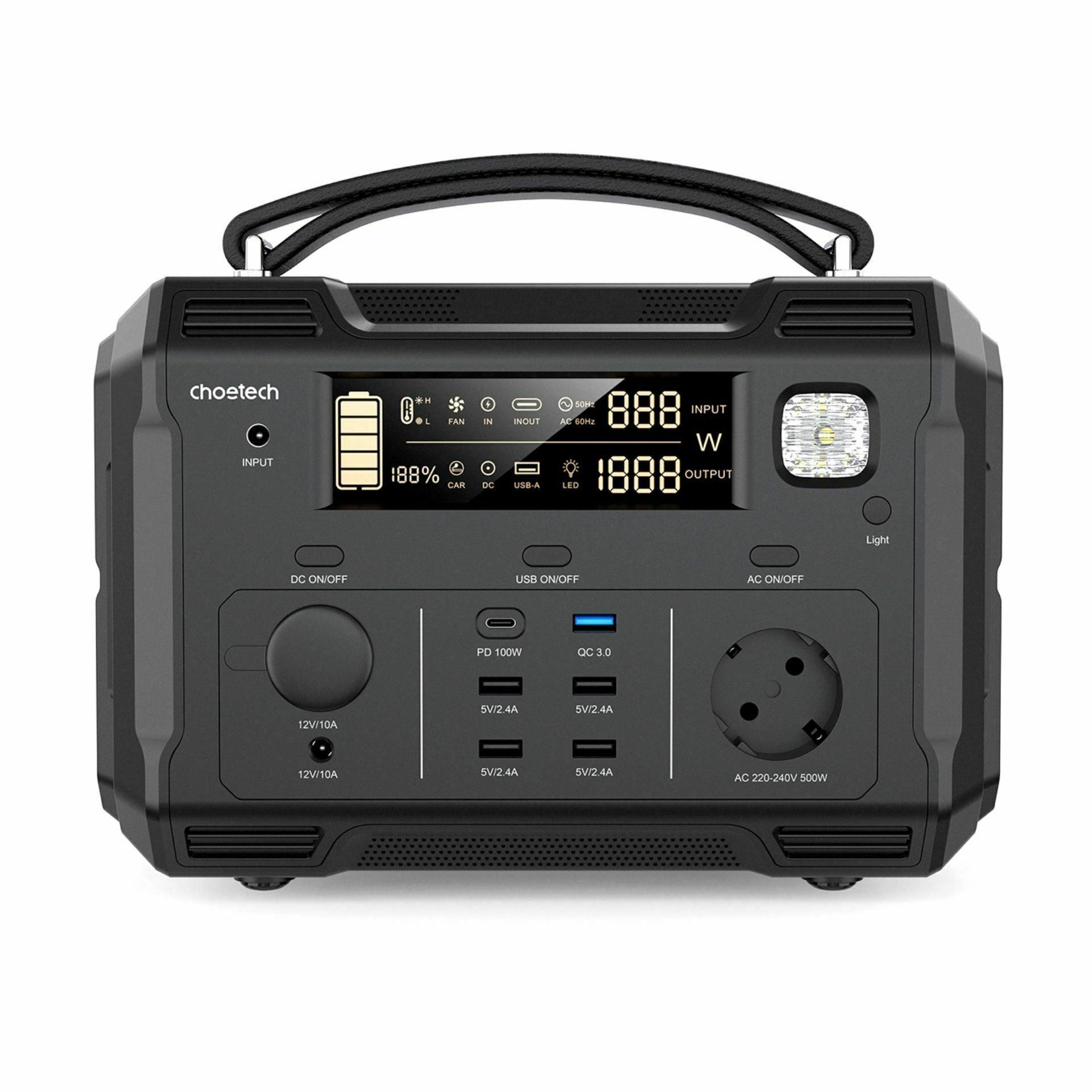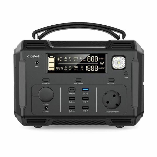 Choetech polnilna postaja je odličen izdelek za ljubitelje narave in potovanj. Polnilna postaja omogoča dostop do električne energije kjer to v naravi ni mogoče. Izhodna moč do 500W zagotavlja nemoteno delovanje naprav kot so prenosnik, televizija, manjši hladilnik, radio itd.
