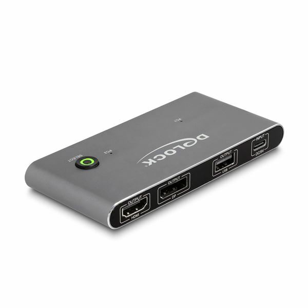 KVM stikalo Delock je priročna rešitev za povezavo dveh računalnikov z izhodom USB TipC DP Alt Mode na en HDMI in en DisplayPort monitor. Z gumbom lahko preklapljate med obema računalnikoma. Multi-Stream Transport (MST) in podpira razširjeno konfiguracijo namizja DisplayPort. V sistemu Windows se priključeni monitorji upravljajo posamično in jih je mogoče združiti v en velik zaslon.