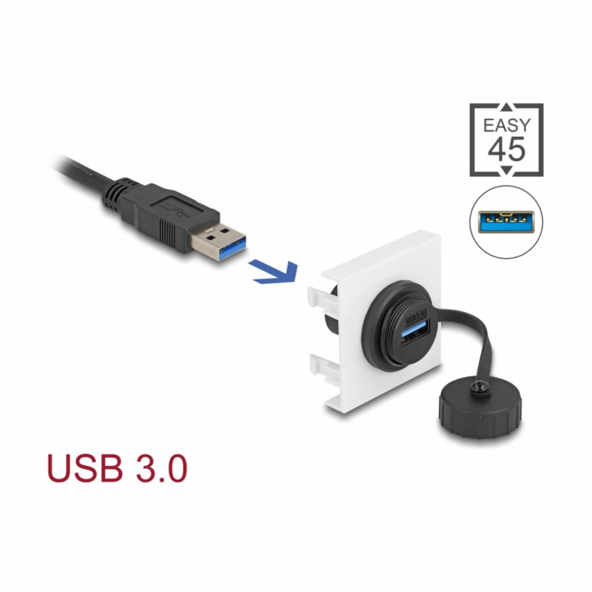 Delock modul Easy 45 je zasnovan tako, da zagotavlja ženski 3.0 USB TipA priključek. Preprost mehanizem za vstavljanje zagotavlja, da je pokrov trdno nameščen in ga je mogoče po potrebi enostavno in brez orodja zamenjati.