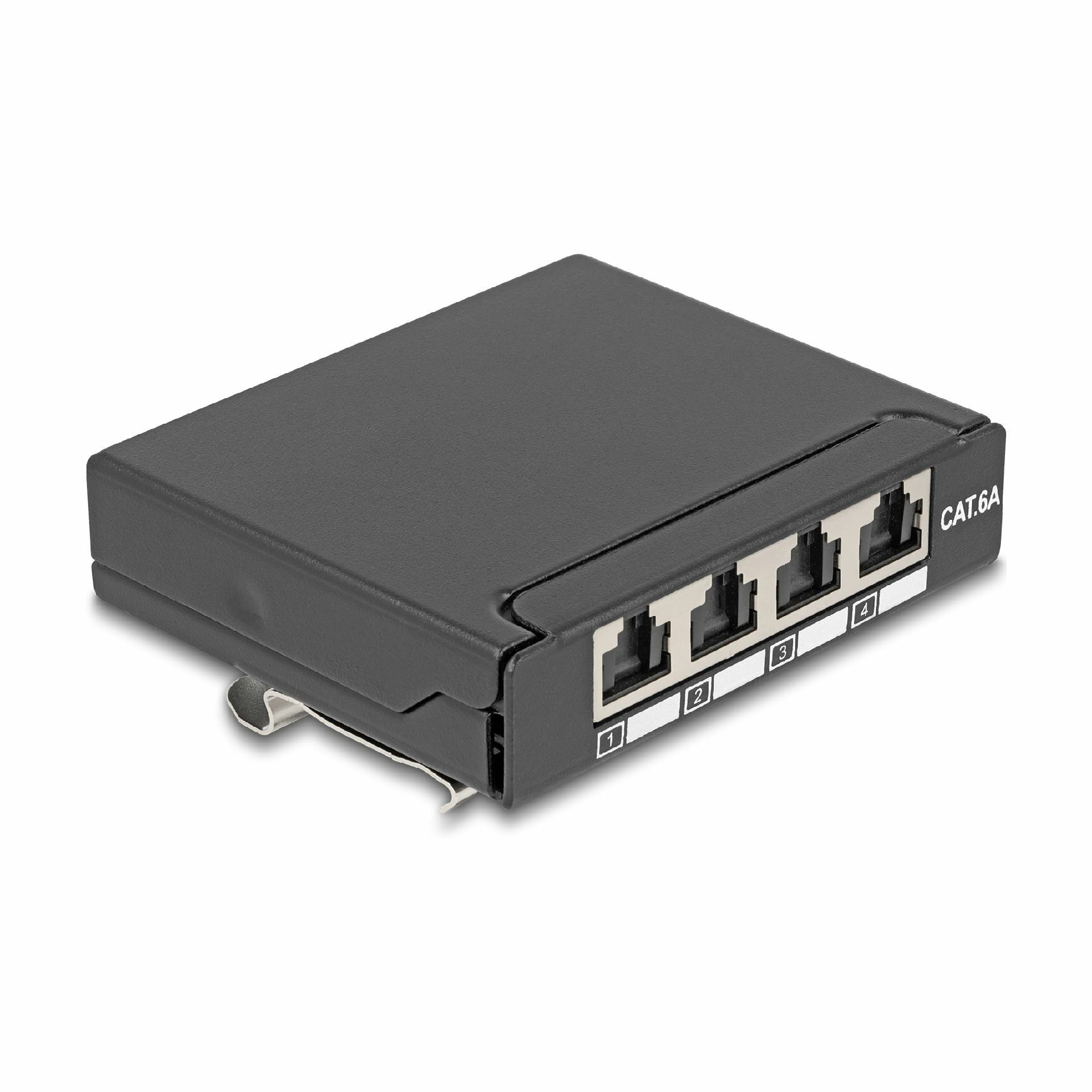 Delock nadometna vtičnica z 4 RJ45 FTP priključki, standarda CAT 6A. Omogoča neposredno montažo na steno, mizo ali DIN-vodilo velikosti 35 mm. Ohišje iz kovine, črna barva, povezovanje z LSA blokom za do-22 AWG kable.