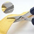 Mikro nazobčani rezalni robovi zagotavljajo čist rez in preprečujejo, da bi vlakna zdrsnila. Škarje so zato idealne za rezanje Kevlar®, Kevlar® mešanih tkanin, poliestra in številnih drugih tehničnih tkanin iz aromatičnih poliamidov.