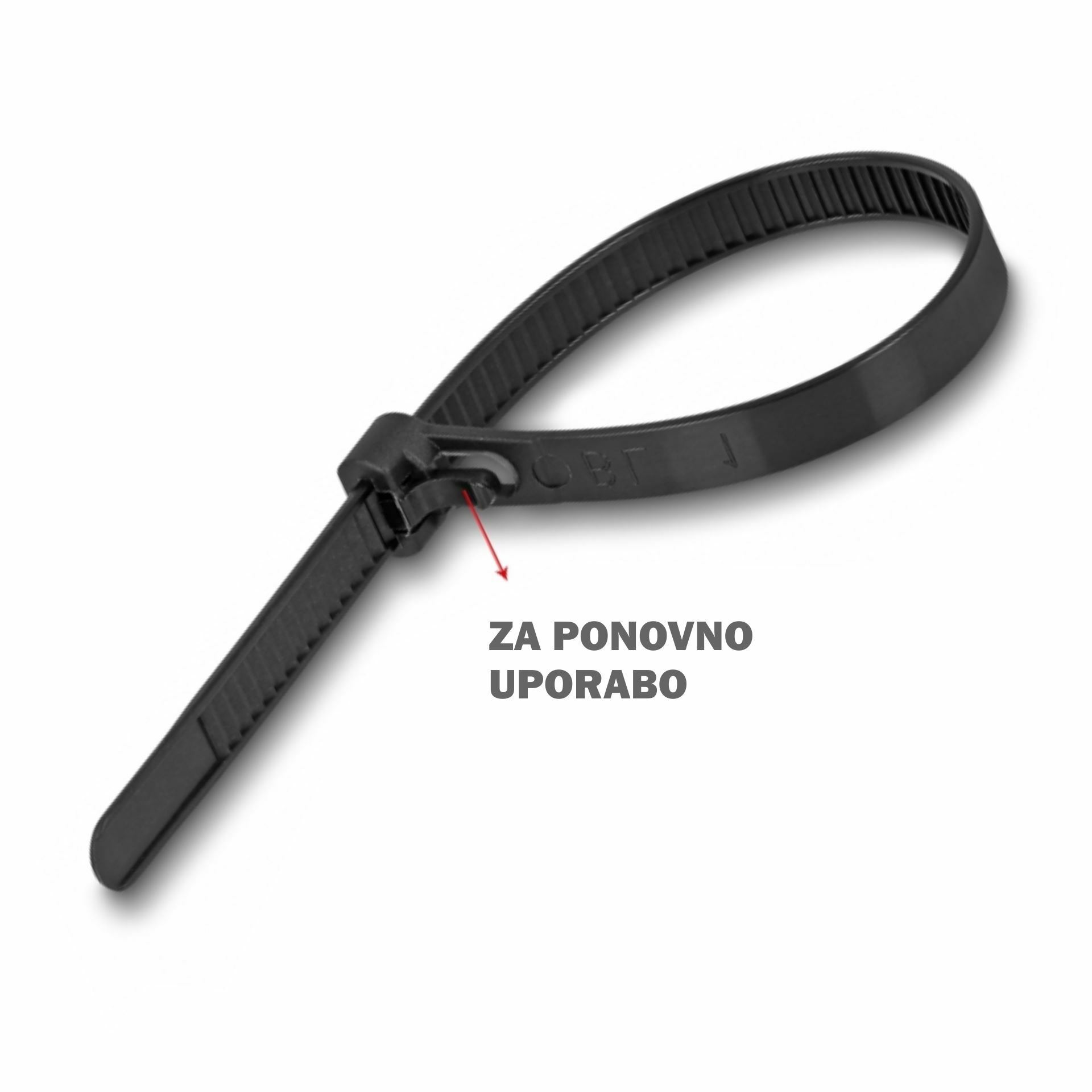 Delock vezice 200x7,5mm lahko uporabite za povezovanje in urejanje kablov, žic ali cevi. Enostavna namestitev in odstranitev vezice z uporabo kljukice na vezici, kar omogoča ponovno uporabo. Odporne na vročino do 85 °C. V pakiranju je 100 kosov.