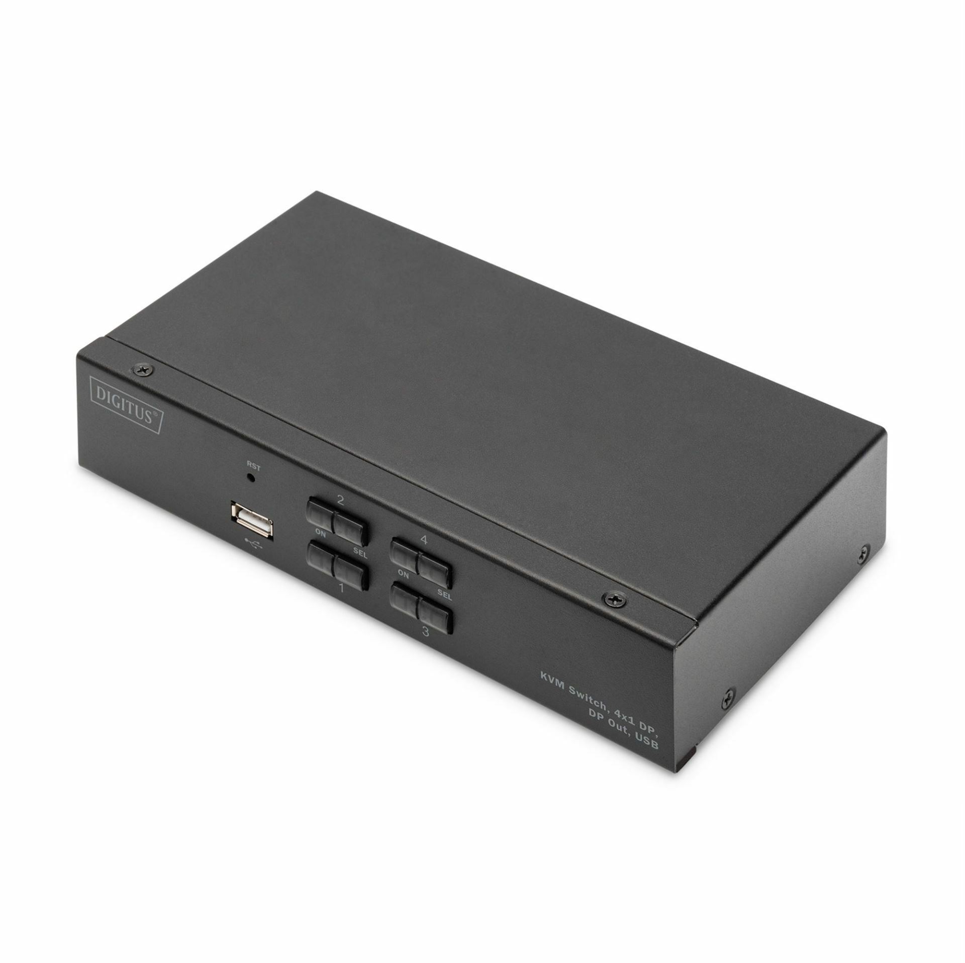 Digitus DS-12891 KVM stikalo 4x1 DP omogoča upravljanje štirih računalnikov z enim kompletom tipkovnice, miške in zaslona. Podpira ločljivost 4K@60Hz, zvok Dolby True HD in DTS HD Master Audio. Opremljeno je s 4x DisplayPort, 4x USB-B, avdio vhodi/izhodi ter dodatnim USB-A na sprednji strani. Preklapljanje je možno prek sprednjega gumba.