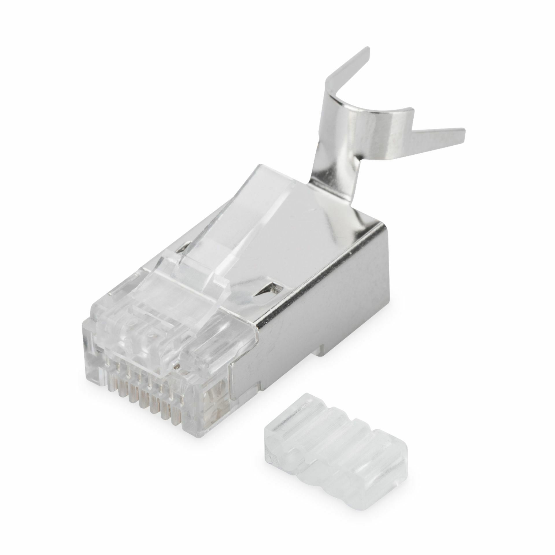 V paketu 100 kos Digitus RJ45 konektorjev za zaključevanje Cat.6A mrežnih kablov z oklopom, priložena uvodnica žic. Primeren za kable AWG 22-23.
