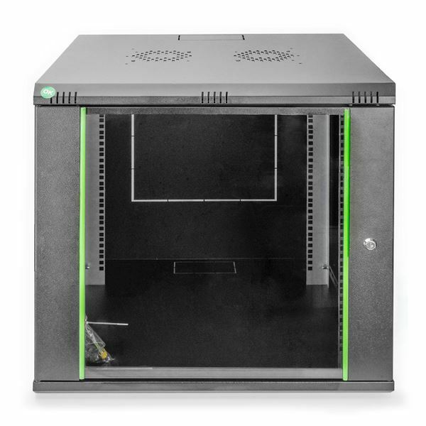 Digitus kabinet za zidno montažo Dynamic Basic Series, je zasnovan za shranjevanje omrežnih komponent in strežniške opreme. Vključuje komplet ozemljitvene žice, set za montažo in ključavnico na sprednjih vratih. Obe stranici na straneh je mogoče sneti. Dimenzije: višina 9U 505, širina 600 mm in globina 600 mm.