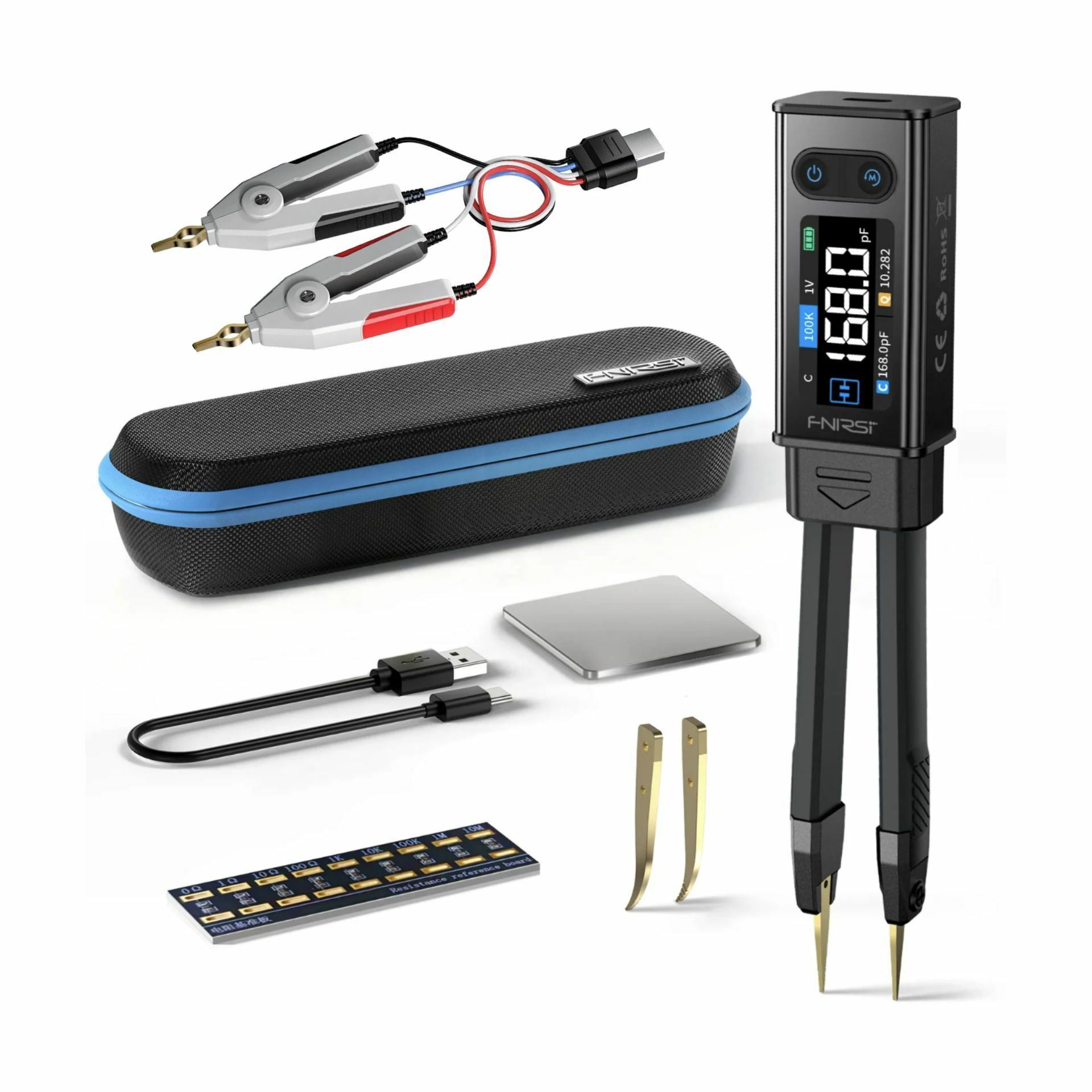 FNIRSI LCR-ST2 je kompakten digitalni LCR mostični merilnik z dvojnim načinom uporabe, pinceta ali Kelvinova sponka, namenjen natančnemu testiranju elektronskih komponent različnih velikosti. Omogoča merjenje upora, kapacitivnosti, induktivnosti, diod in napetosti do ±30 V ter podpira pet testnih frekvenc od 100 Hz do 100 kHz in štiri RMS testne napetosti.