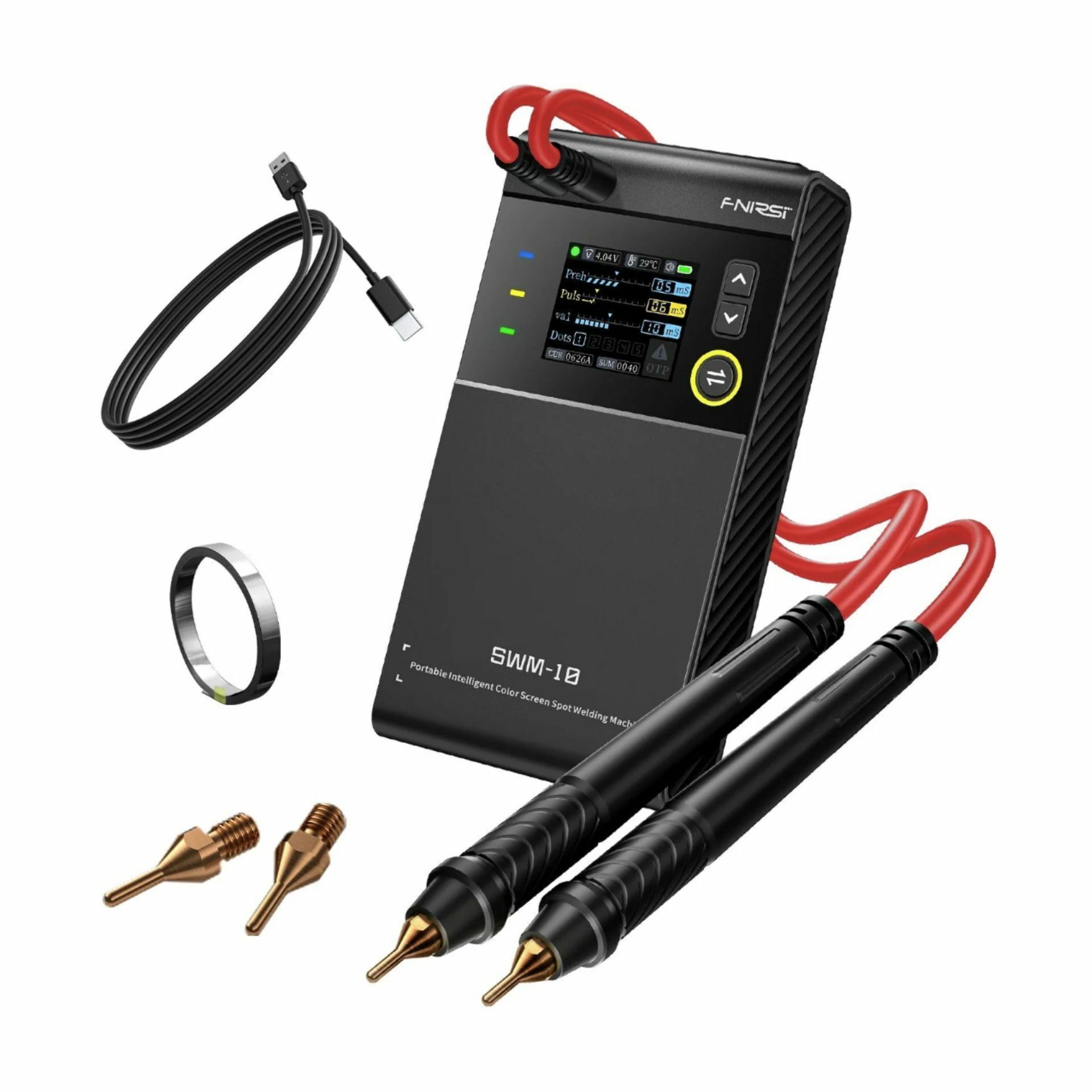 FNIRSI SWM-10 je prenosni pametni točkovni varilni aparat z barvnim 1.8-palčnim LCD zaslonom. Omogoča točkovno varjenje kovinskih trakov do debeline 0.25 mm, največji tok 1200 A, vgrajeno baterijo 5000 mAh in funkcijo prenosne baterije.