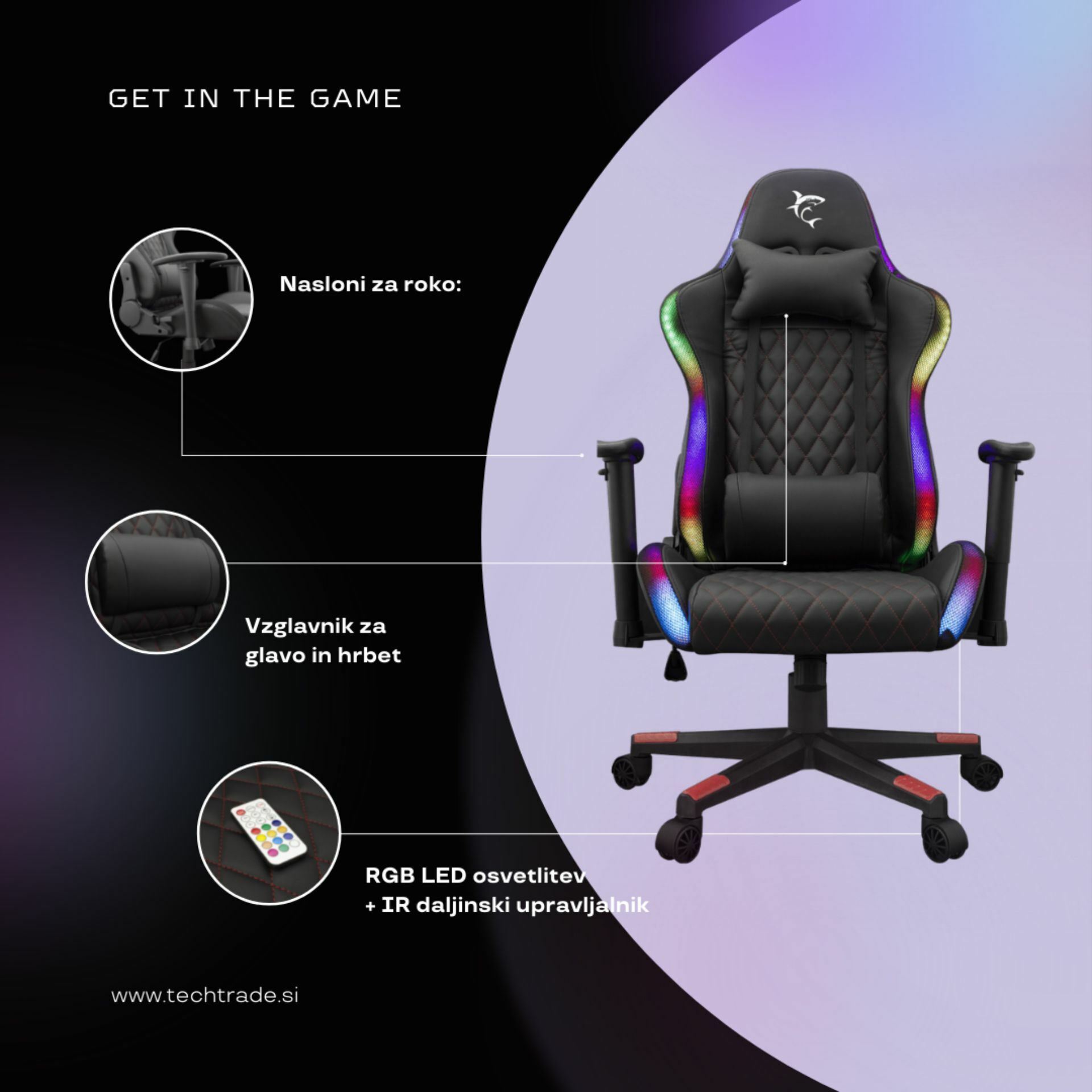 White Shark Thunderbolt gaming stol črne barve, z RGB LED osvetitvijo omogoča daljši čas sedenja brez bolečin v hrbtu. . S priloženim IR daljinskim upravljalnikom lahko izbirate med različnimi načini in barvami osvetlitve.