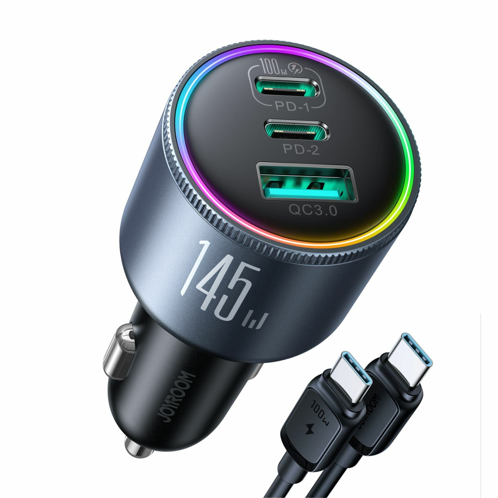 Paket vsebuje: 1x Joyroom polnilec avtomobilski 12V 24V 145W PD QC TipA TipC črn JR-CCN07, 1x USB-C na USB-C kabel 100W dolžine 1,2m, 1x Navodila