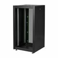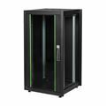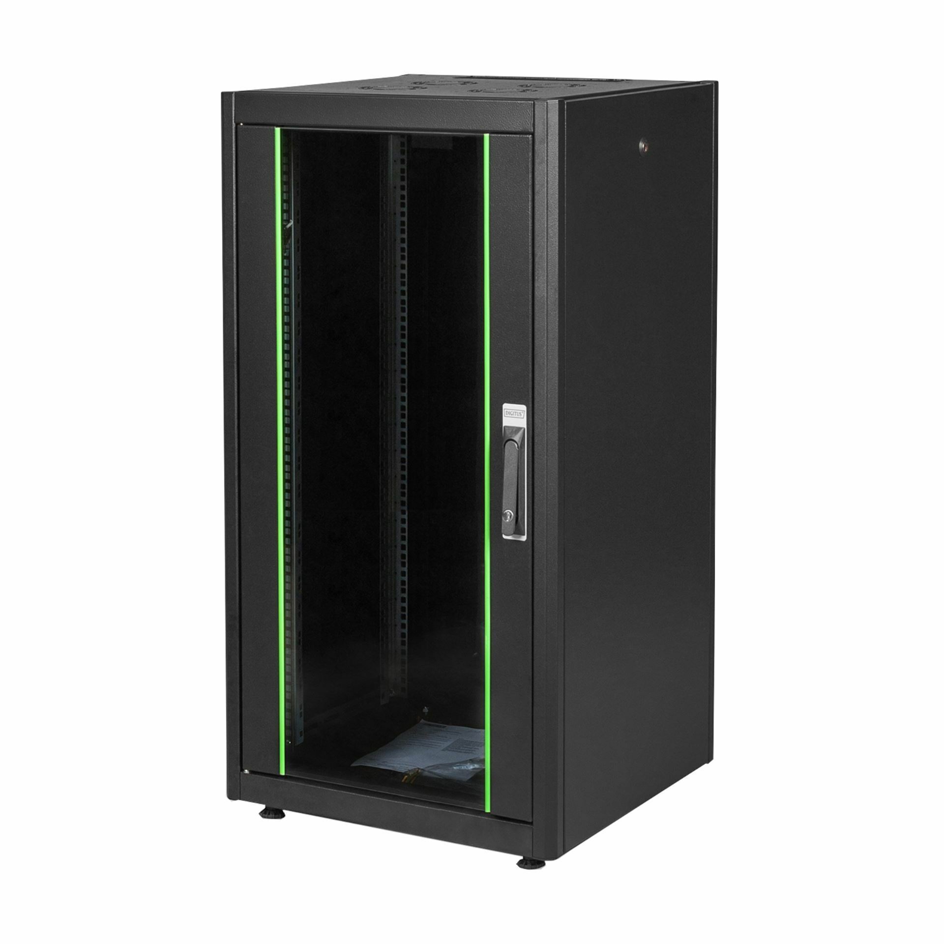 Dynamic Basic, višine 22U 1155 mm, širine 600 mm in globine 600 mm, v črni barvi (RAL 9005). Vsaka reck omara ima na stropu namestitvene točke za ločeno razpoložljive ventilatorske module – omarice privzeto stojijo na izravnalnih nogah, vendar jih je mogoče zamenjati za izbirne koleščke. Tako vhodna vrata z varnostnim steklom velike površine in kotom odpiranja 120° kot tudi 3 stranske stene so opremljene z 1-točkovnim zaklepanjem - Tečaj vhodnih vrat je mogoče spremeniti na obe strani...