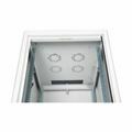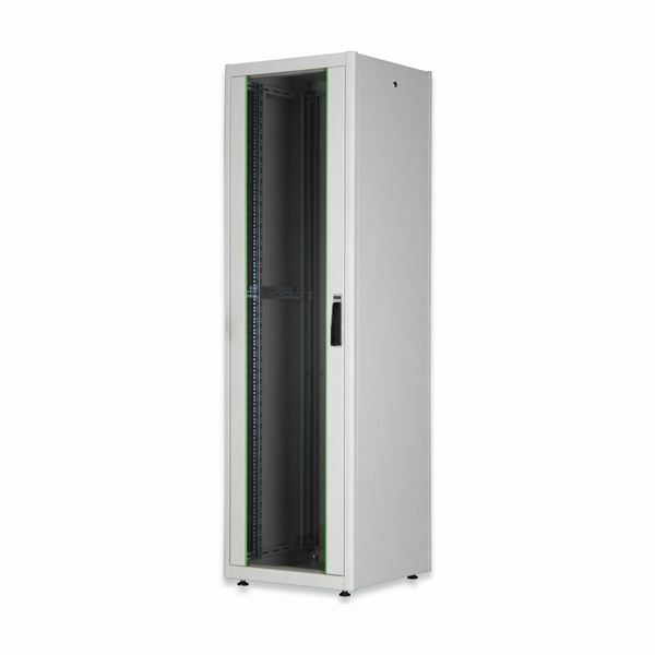 Dynamic Basic, višine 22U 1155 mm, širine 600 mm in globine 600 mm, v sivi barvi (RAL 7035). Vsaka komunikacijski kabinet ima na stropu namestitvene točke za ločeno razpoložljive ventilatorske module – omarice privzeto stojijo na izravnalnih nogah, vendar jih je mogoče zamenjati za izbirne koleščke. Tako vhodna vrata z varnostnim steklom velike površine in kotom odpiranja 120° kot tudi 3 stranske stene so opremljene z 1-točkovnim zaklepanjem - Tečaj vhodnih vrat je mogoče spremeniti na obe strani...