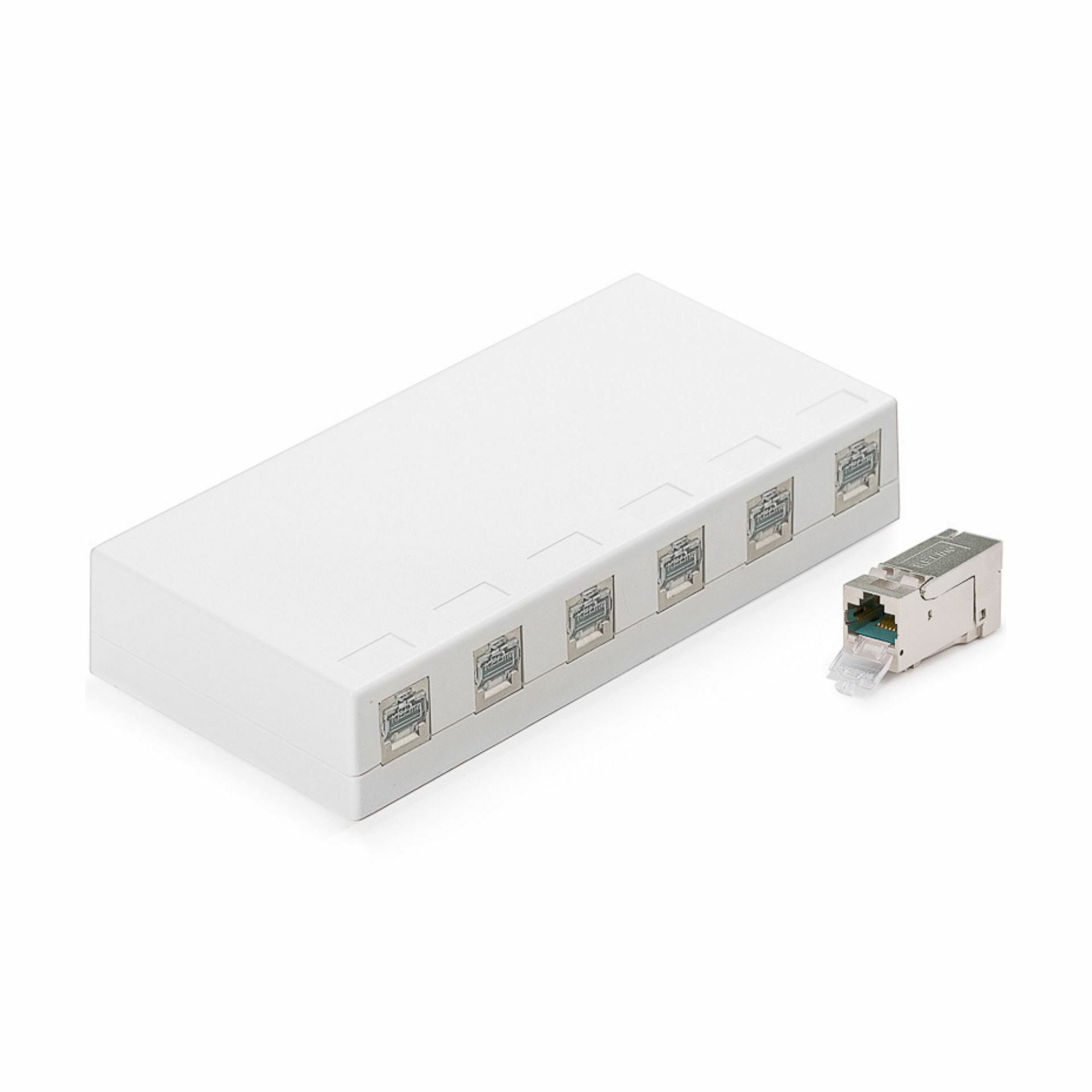 KELine nadometna doza za 6x RJ45 osnovne elemente. Priloženi so Keline moduli CAT.6A FTP z zaščitnimi vratci. Enostavna montaža osnovnih elementov in nadometne doze.
