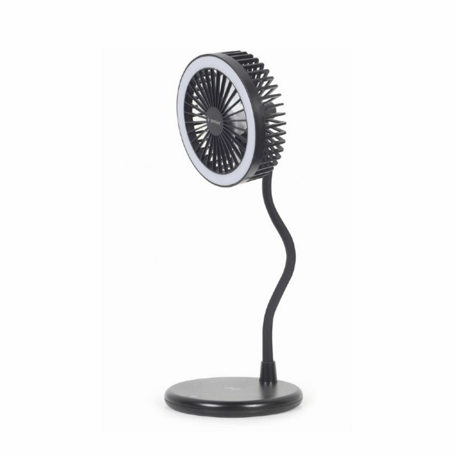 Gembird LED namizna svetilka z vgrajenim ventilatorjem omogoča tudi brezžično polnjenje mobilnega telefona. Odličen primer uporabe je ob spajkanju za dodatno osvetlitev, ventilator s fleksibilnim stojalom pa istočasno poskrbi za pomoč pri odstranitvi škodljivega dima. S pritiskom na gumb prilagodite hitrost ventilatorja vašim potrebam, prav tako pa lahko prilagodite moč osvetlitve LED svetilke.