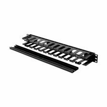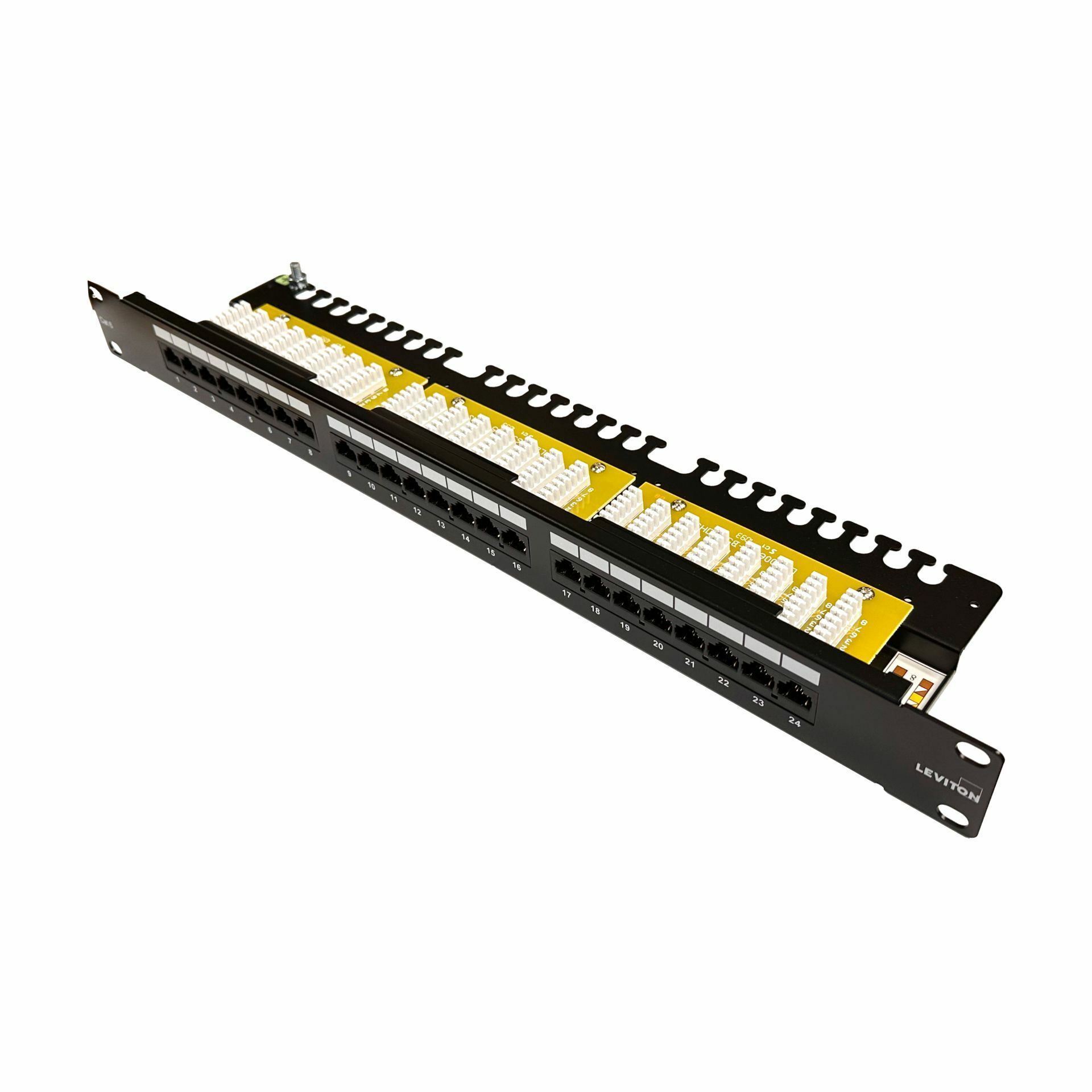 Leviton 24 portni UTP panel CAT6+ za montažo v komunikacijsko omaro, material jeklo, črna barva.