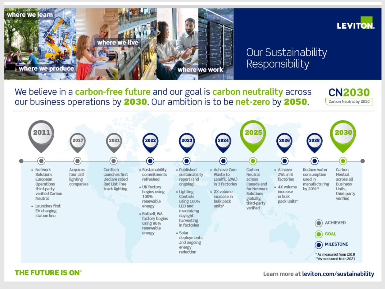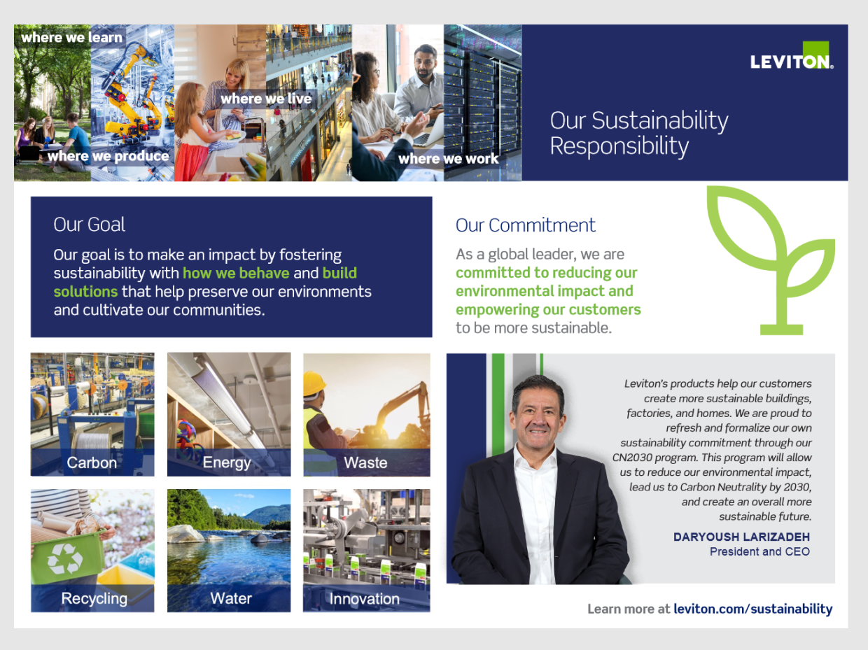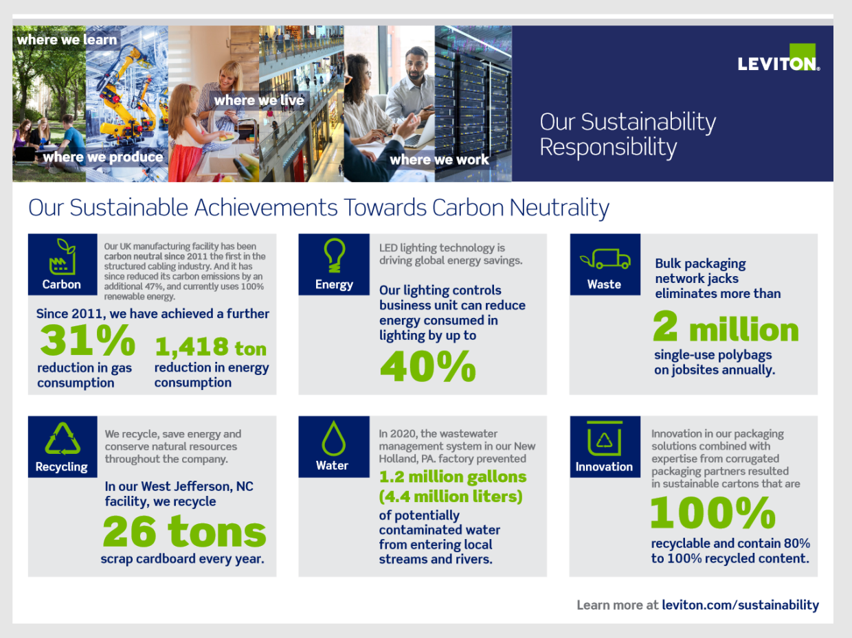 Leviton Network Solutions je zavezan varovanju okolja z načrtovanjem, proizvodnjo in dobavo trajnostne omrežne infrastrukture. Sledijo strogim proizvodnim praksam in razvijajo izdelke, ki lahko prispevajo k večjim prihrankom energije, ustvarijo manj odpadkov in zmanjšajo vaš skupni ogljični odtis.