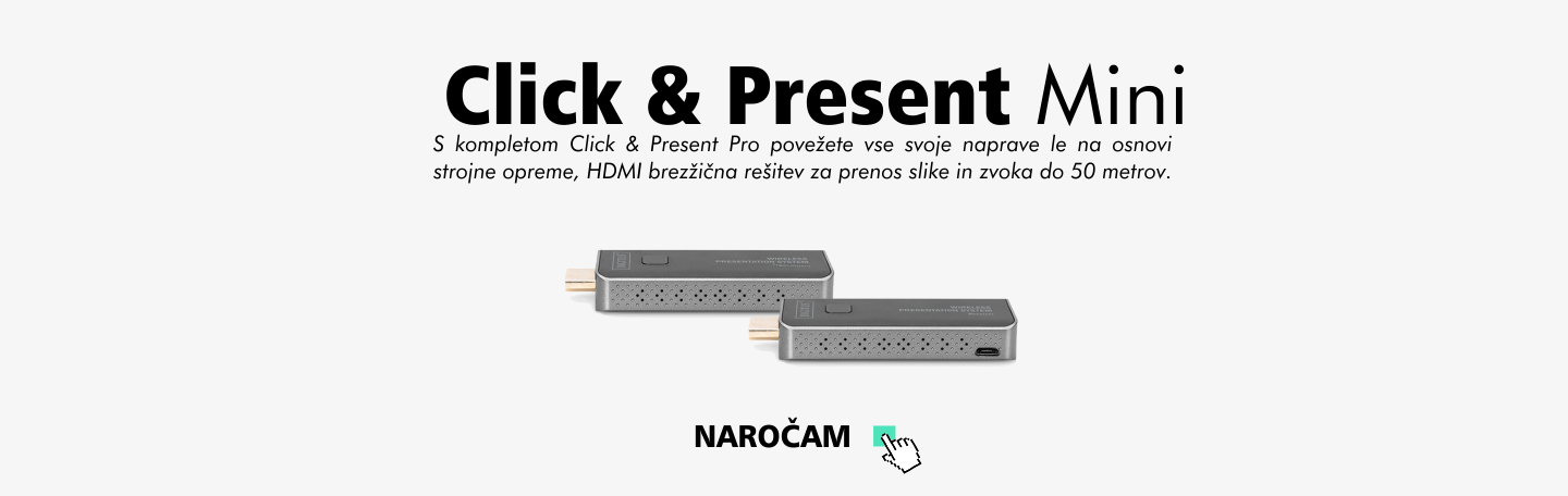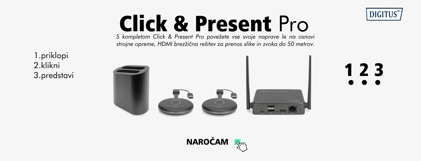 sobah. Digitus predstavlja različne komplete za različne potrebe. Rešitev je enostavna, ker za njeno delovanje ne potrebujete posebne programske opreme. Click & Present je sistem, ki ga enostavno priklopite in že lahko začnete z uporabo (Plug and Play). Sprejemnik je povezan na veliki zaslon v sejni sobi, vi pa morate zgolj priklopiti kompakten in lično oblikovan oddajnik v USB ali HDMI izhod na svojem prenosnem računalniku, na njem pritisniti namensko tipko in vsebina vašega namizja
