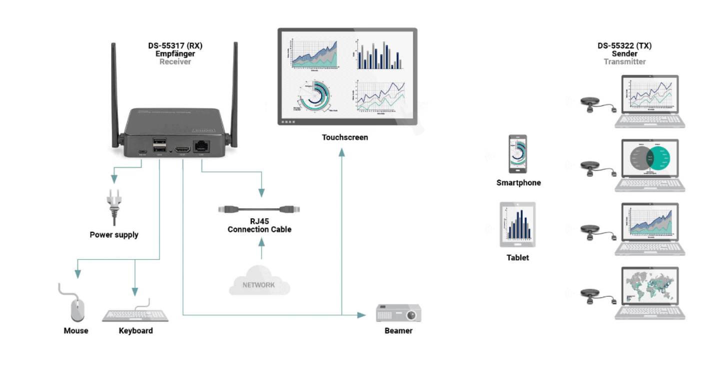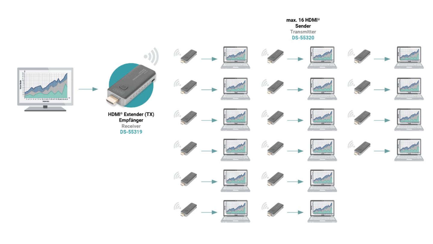 Predstavitvene rešitve Digitus vam pomagajo deliti vsebino na sestanku ali sodelovati v projektu. S sistemom Click & Present Pro je mogoče s sprejemnikom povezati do 30 udeležencev. In ne samo to: hkrati lahko do 4 udeleženci svojo vsebino