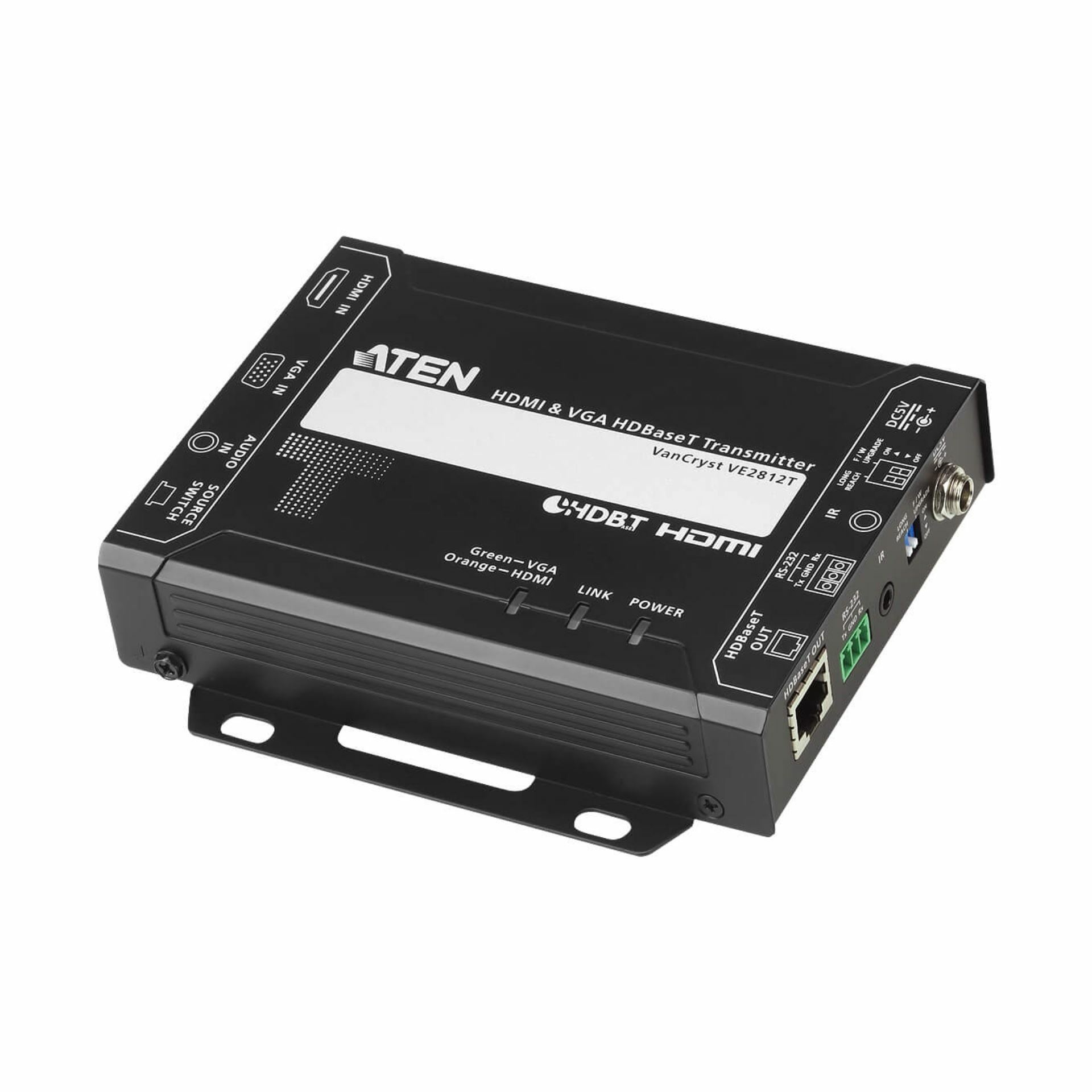Aten line extender VE2812T je oddajnik za pošiljanje VGA (z avdio) in HDMI signalov do 100m preko Cat.5e/6/6A mrežnih kablov. Oddajnik zagotavlja zanesljiv prenos HDMI signalov, podpira 3D, Deep Color in vgrajene HD brezizgubne avdio formate. Poleg tega podpira oddajnik tudi Long Reach Mode, ki omogoča prenos ločljivosti 1080p do 150m s Cat.5e/6 kabli.