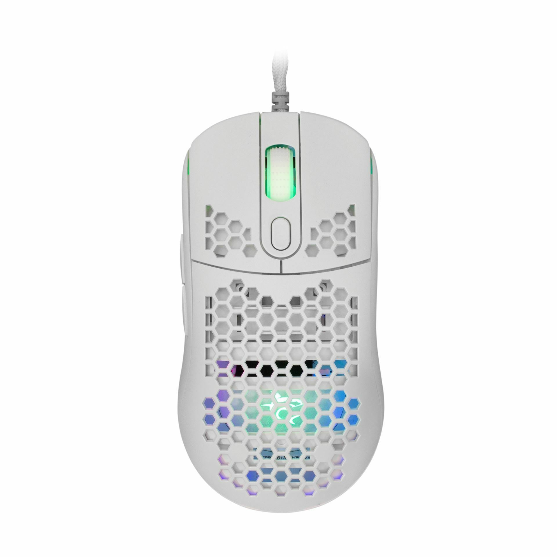 White Shark GALAHAD je ultra lahka miška (72g) bele barve, s Honeycomb dizajnom, minimalistična in simetrično oblikovana, odlična za igranje iger ali resno delo z visoko natančnostjo za katero skrbi senzor z 6400 DPI in pospeški 22.5G.