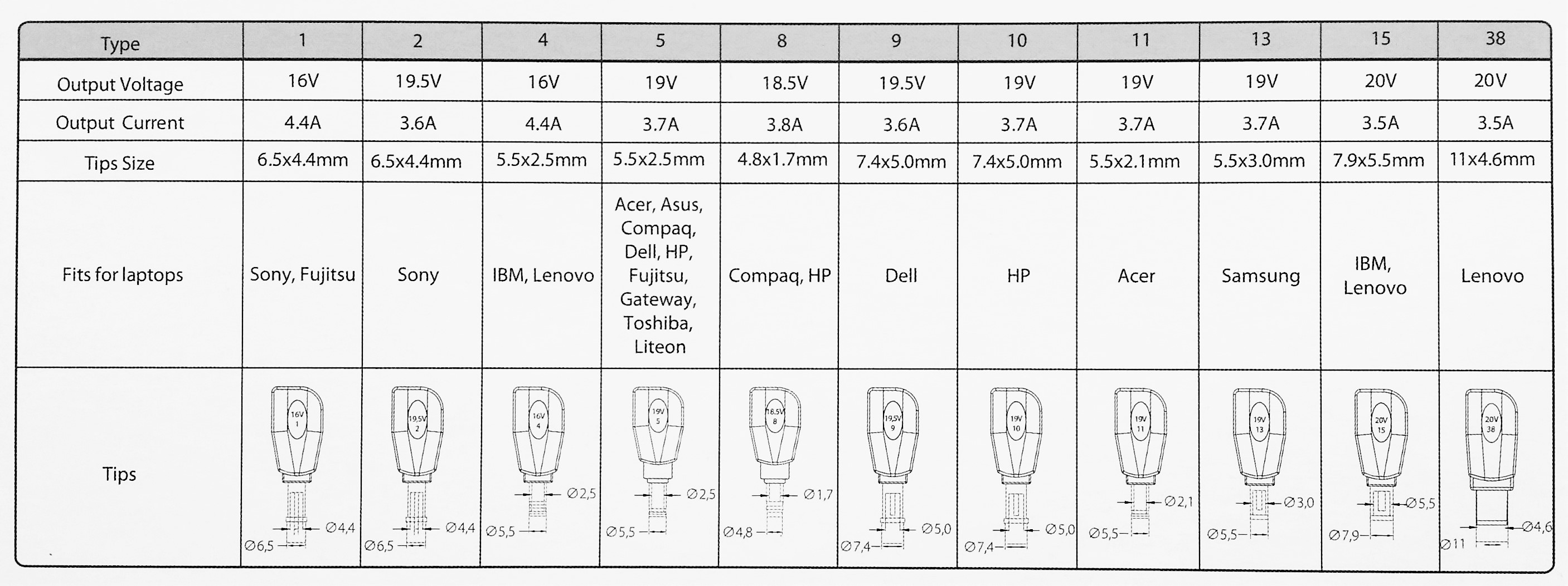 Efektivnost nad 85%. 11 različnih zamenljivih vmesnikov za prenosnike, samodejno prilagajanje voltaže.