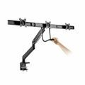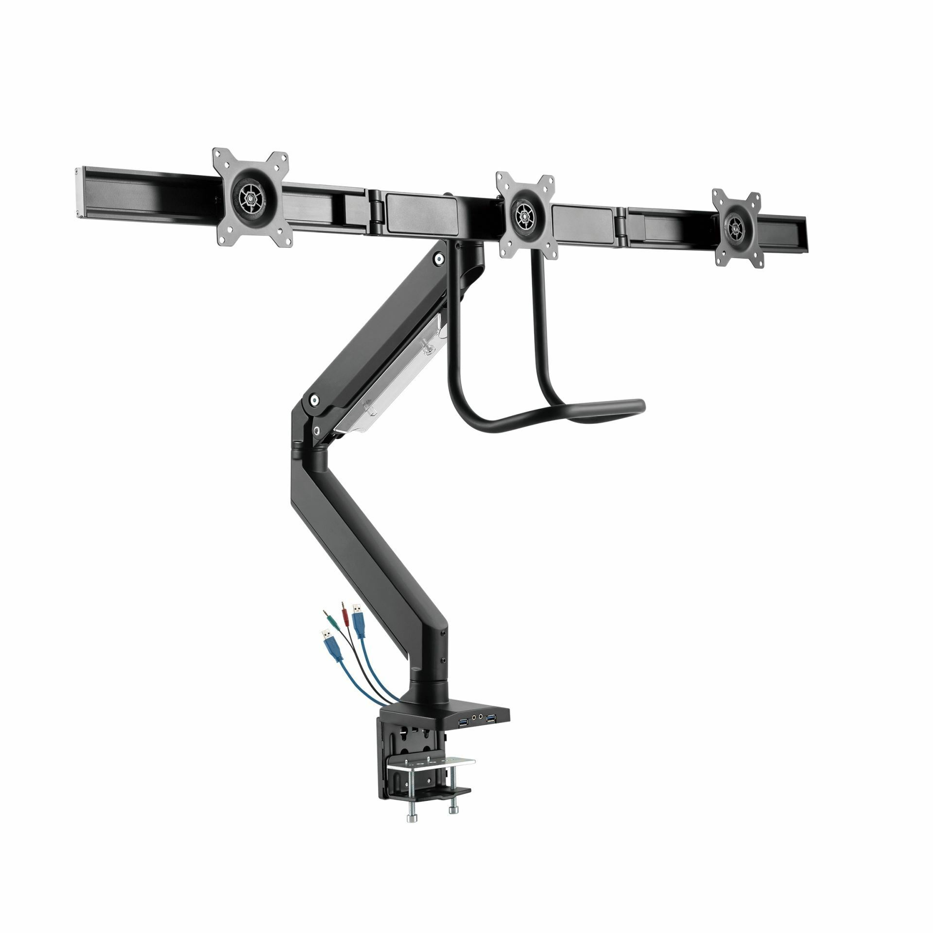White Shark RHAMSES III je namizni nosilec s plinsko vzmetjo, na katerega lahko namestite tri monitorje. Vsak monitor je mogoče vrteti neodvisno. Z USB in multimedijskimi priključki lahko vsak zaslon še vedno uporabljate za prenos podatkov, polnjenje itd.