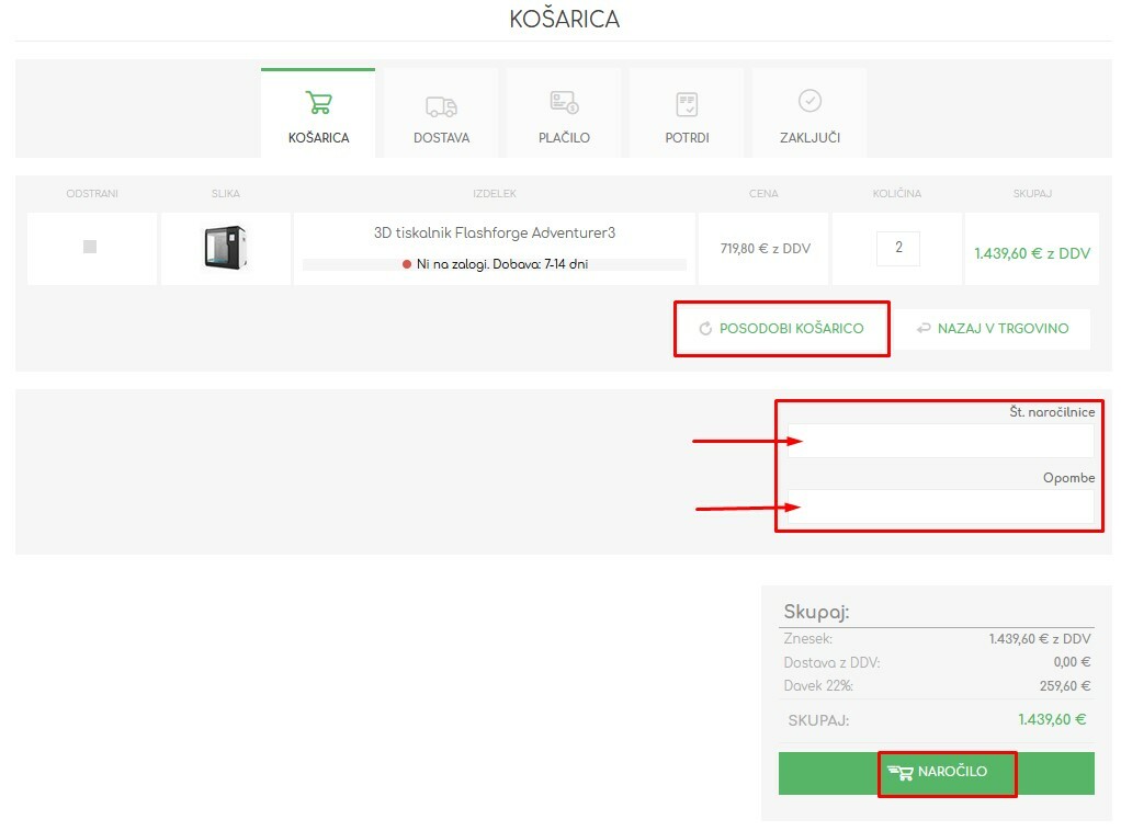 - V košarici na koraku ‚Košarica‘ lahko popravite količino izdelkov v košarici, ali odstranite izdelke iz košarice, te popravke pa uporabite s klikom na gumb ‚Posodobi košarico‘. Prav tako lahko pri tem koraku v spodnjem desnem kotu vpišete št. naročilnice (v kolikor potrebujete ta podatek na izdanem računu) in pa opombe ob naročilu. Za nadaljevanje nakupa kliknite na gumb ‚Nakup‘.
