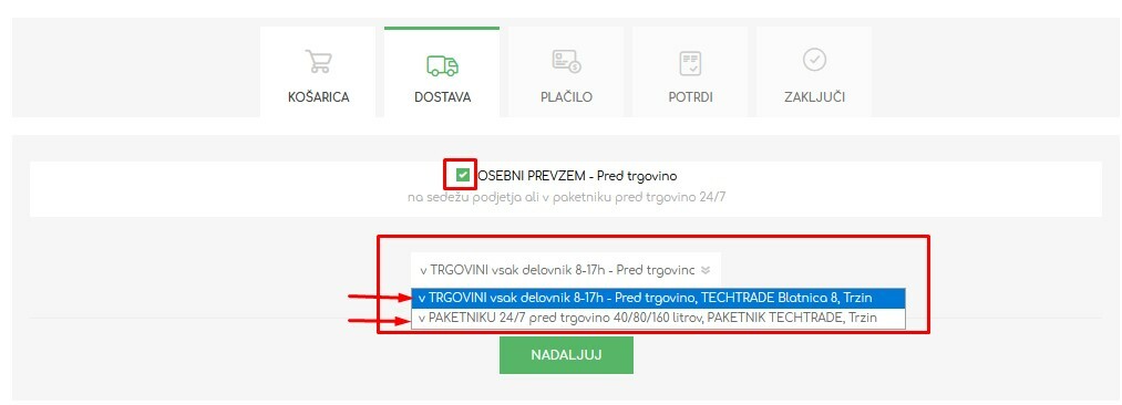 - Nadaljujete na način dostave ali prevzema in vrsto plačila.