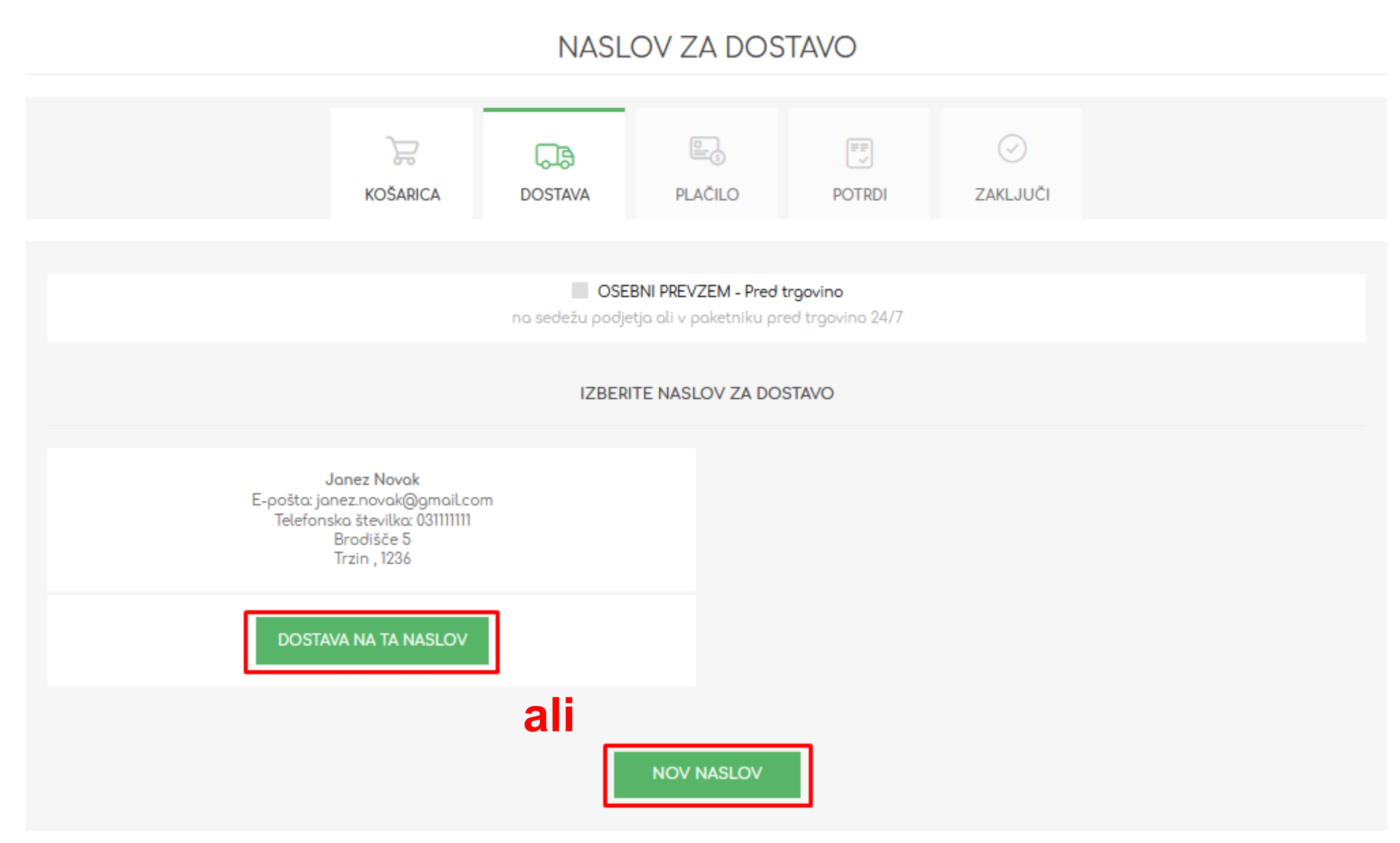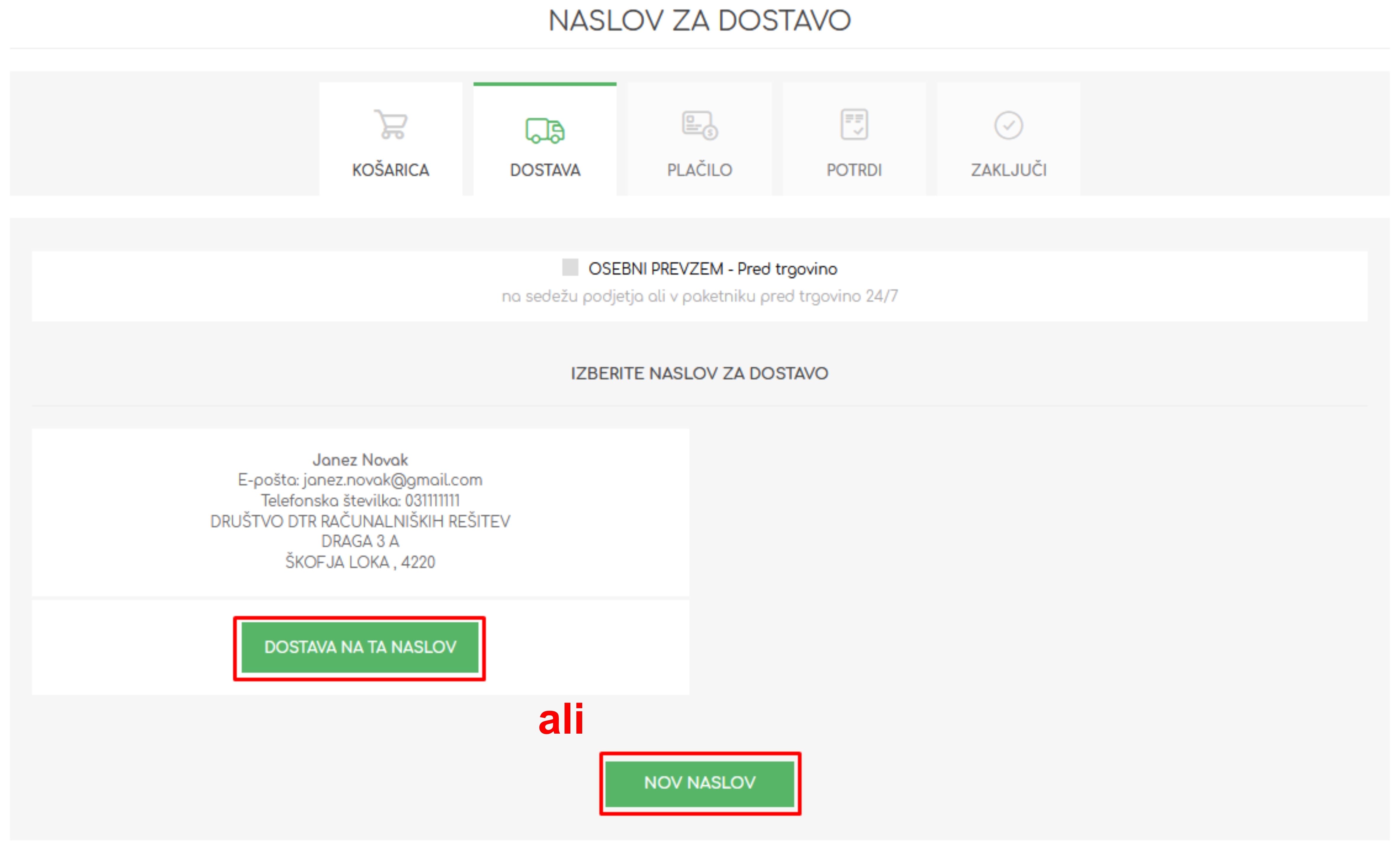 - V drugem koraku ‚dostava‘ izberete ali dodate željen naslov za dostavo ali pa izberete osebni prevzem.