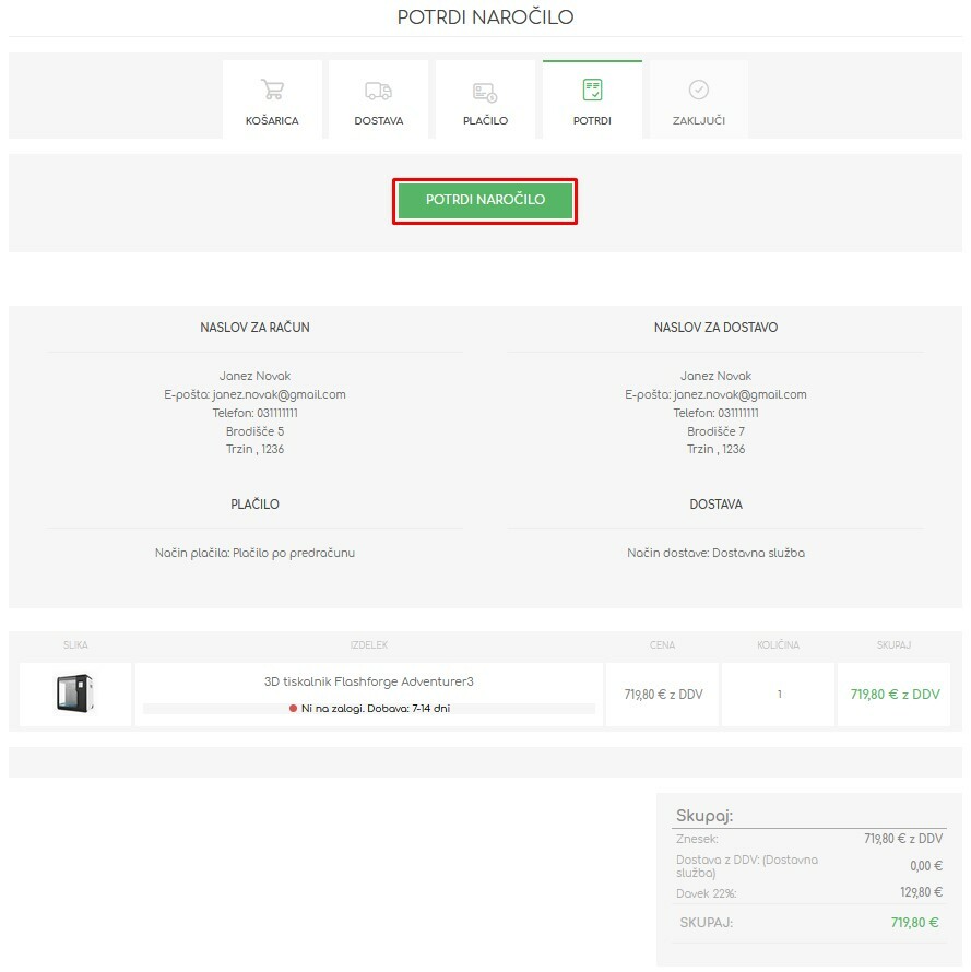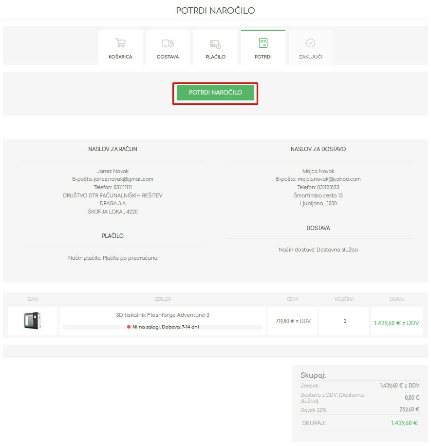 - Še enkrat preverite pravilnost vseh podatkov. Do naročila vas sedaj loči le še klik na gumb ‚Potrdi naročilo‘.