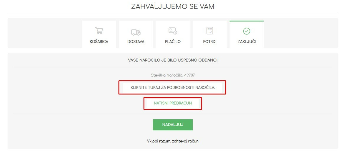 - Na koraku ‚Zaključi‘ si lahko ogledate podrobnosti vašega naročila ali natisnete predračun oz. račun (odvisno od izbranega načila plačila).