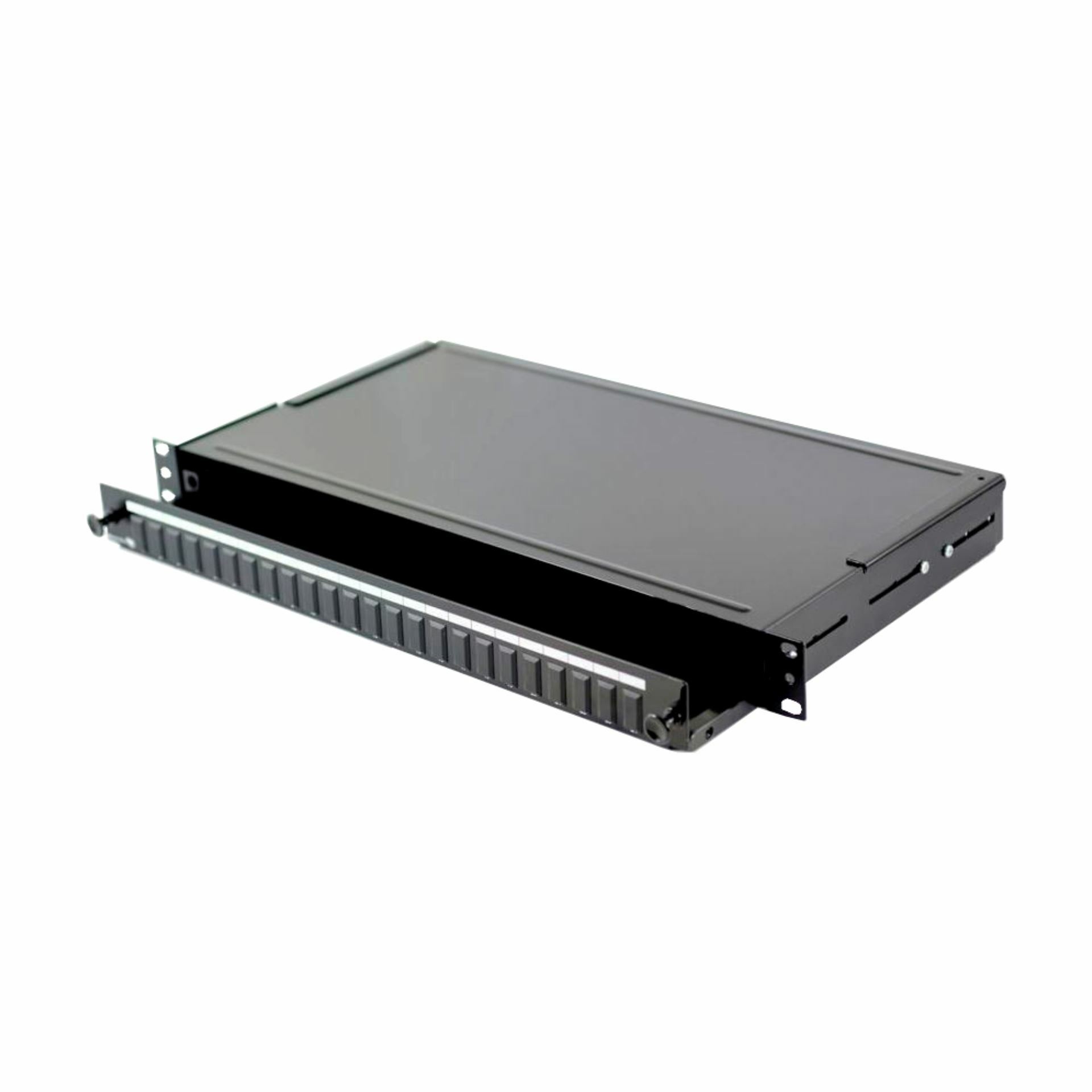 Leviton 19" optični panel, prostor za 24 optičnih vmesnikov, material jeklo, črne barve.