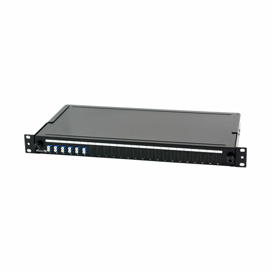 Leviton 19" optični panel za vgradnjo v komunikacijski kabinet, material jeklo, črne barve.