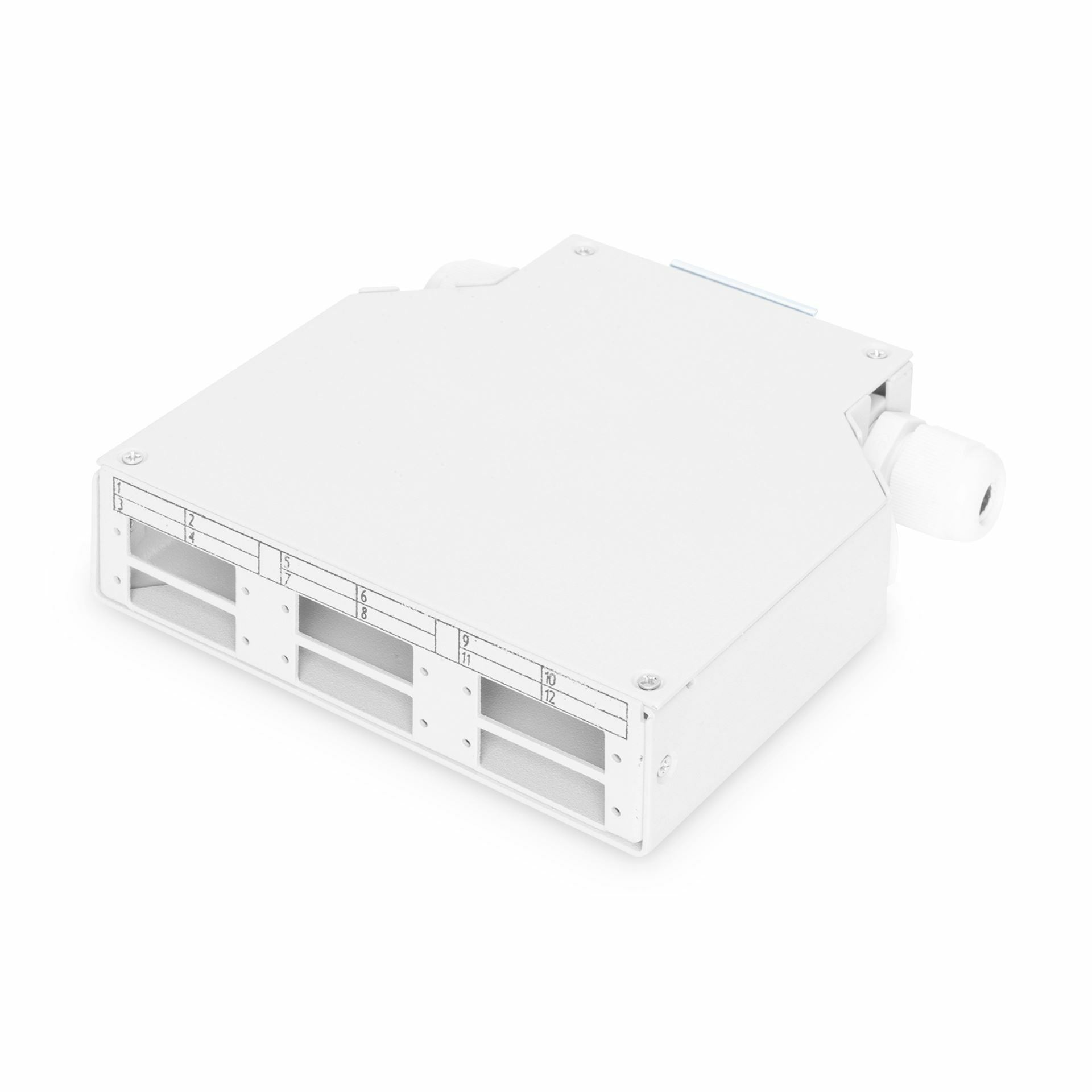 Optični panel za montažo na DIN letev. za 6x SC//DX spojkeKovinsko ohišjeDimenzije: 125 x 130 x 35 mm