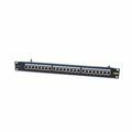 Leviton panel CAT6+ za montažo v komunikacijsko omaro, material jeklo, črna barva (RAL 9005).