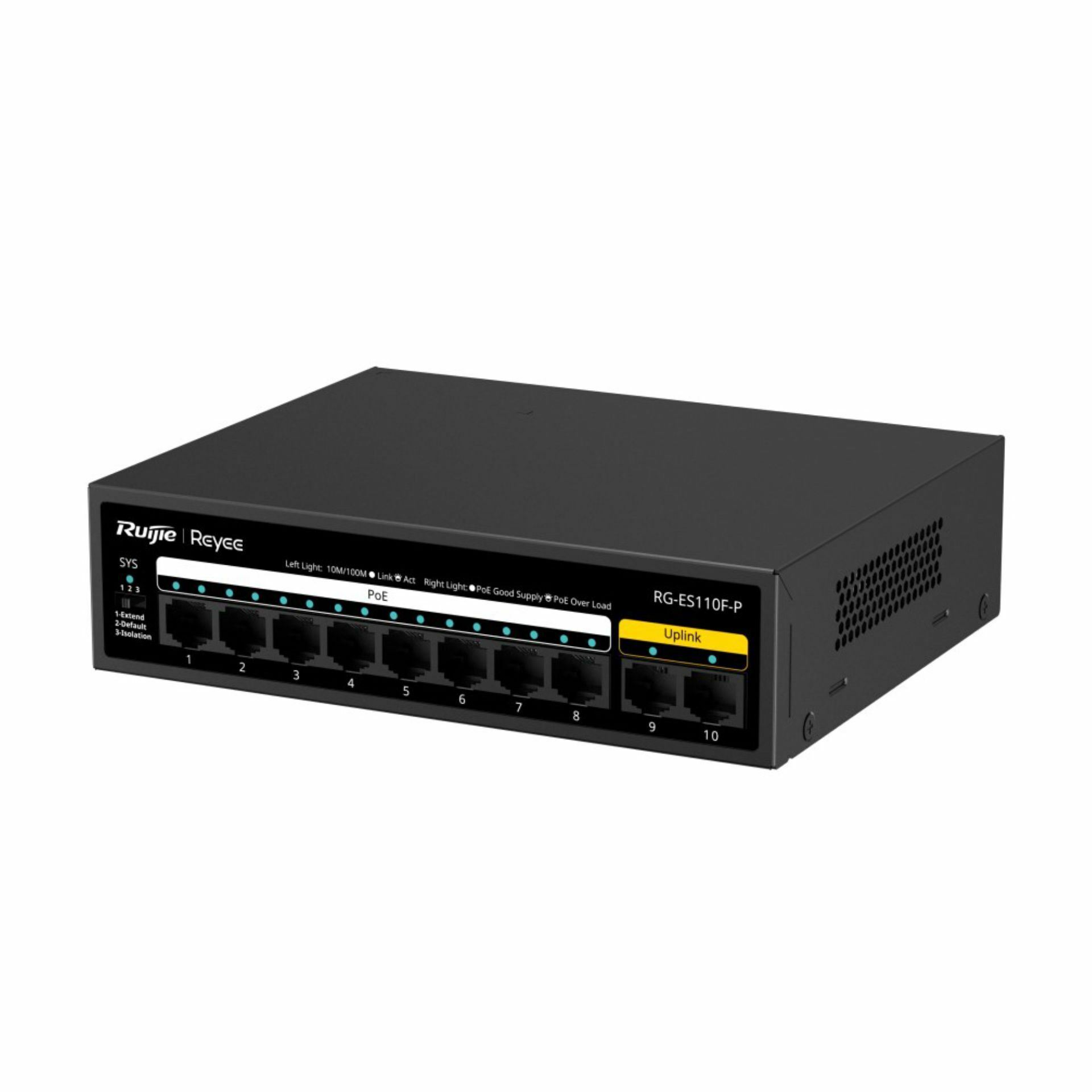 Ruijie RG-ES110F-P 10-portno 100Mb stikalo s skupno močjo osmih PoE izhodov 110W je idealno za podjetja, gostinstvo, tovarne, izobraževalne ustanove, trgovine in nadzorne sisteme.