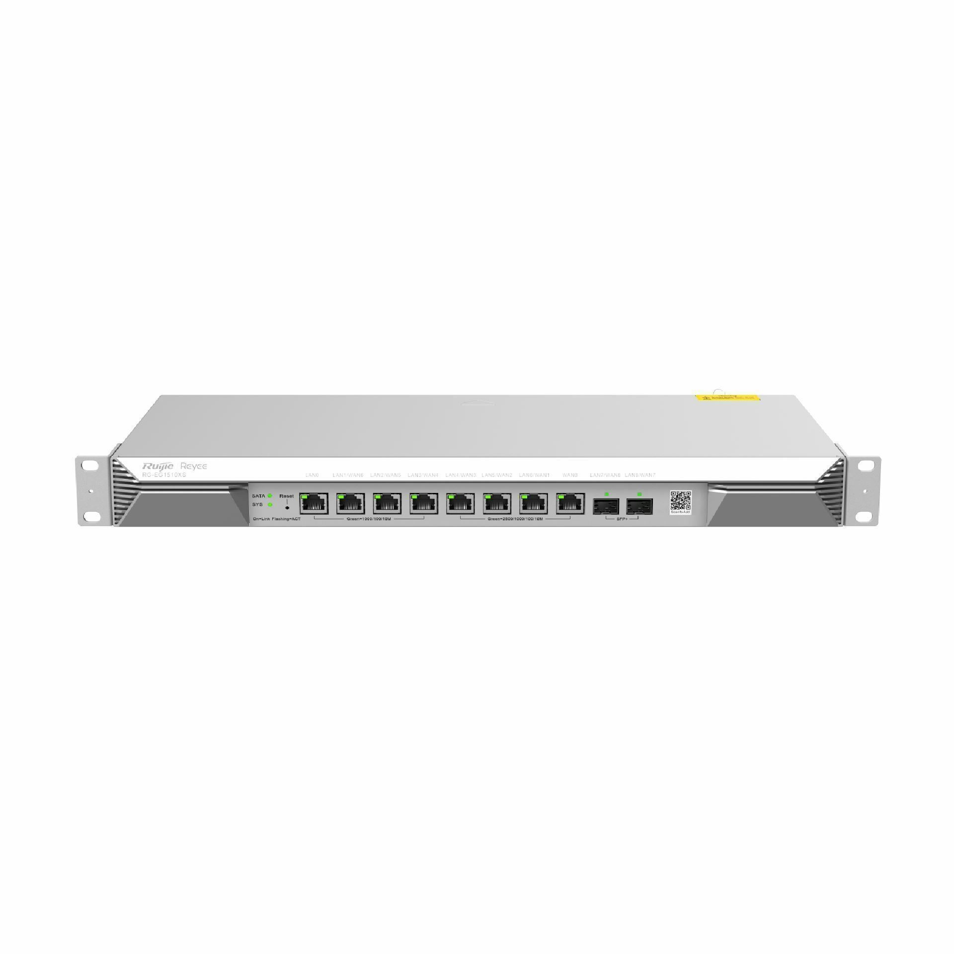 Ruijie Reyee RG-EG1510XS je zmogljiv usmerjevalnik za do 1500 uporabnikov. Podpira optične hitrosti do 10 Gbps (SFP+), vgradnjo 2.5'' 1TB SATA HDD diska za shranjevanje in zagotavlja stabilno žično povezavo. Podpira dva WAN vmesnika in lahko deluje v hot standby načinu za neprekinjeno delovanje omrežja.