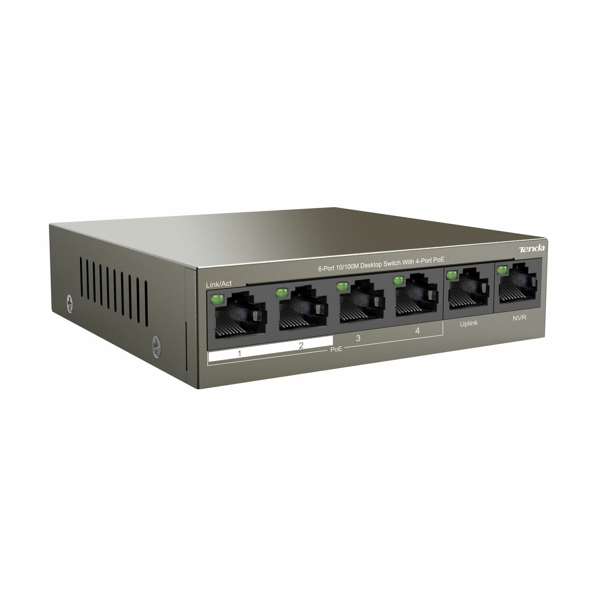 Tenda 6 vratno stikalo 10/100 s 4x PoE podporo do 58W in 2x 10/100 uplink vmesnikoma (enega povežete na usmerjevalnik, drugega pa neposredno na NVR snemalnik)
